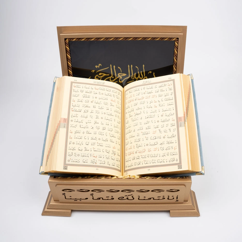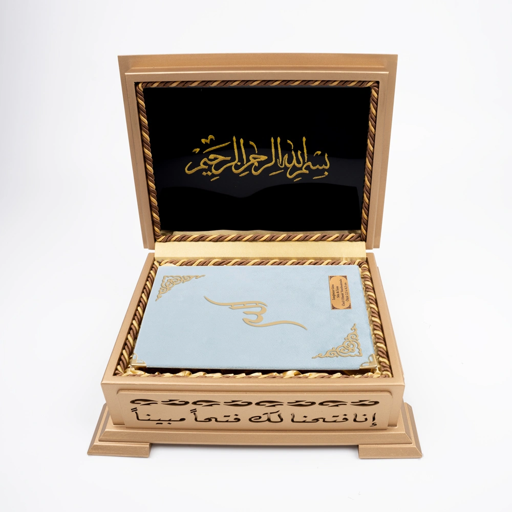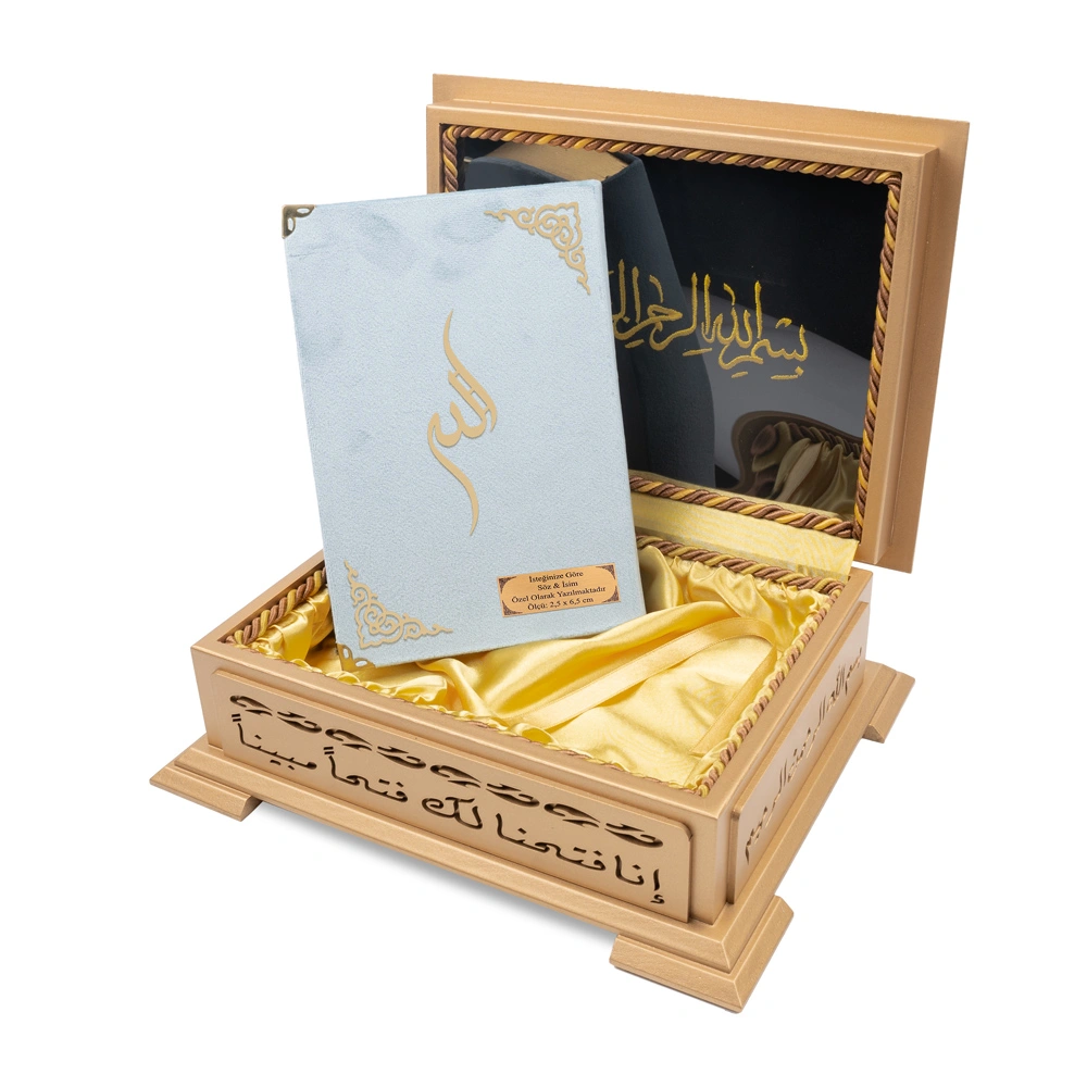 Ahşap Kutulu Kadife Kuran-ı Kerim (Hafız Boy, Divan Lafzatullah, Mavi)