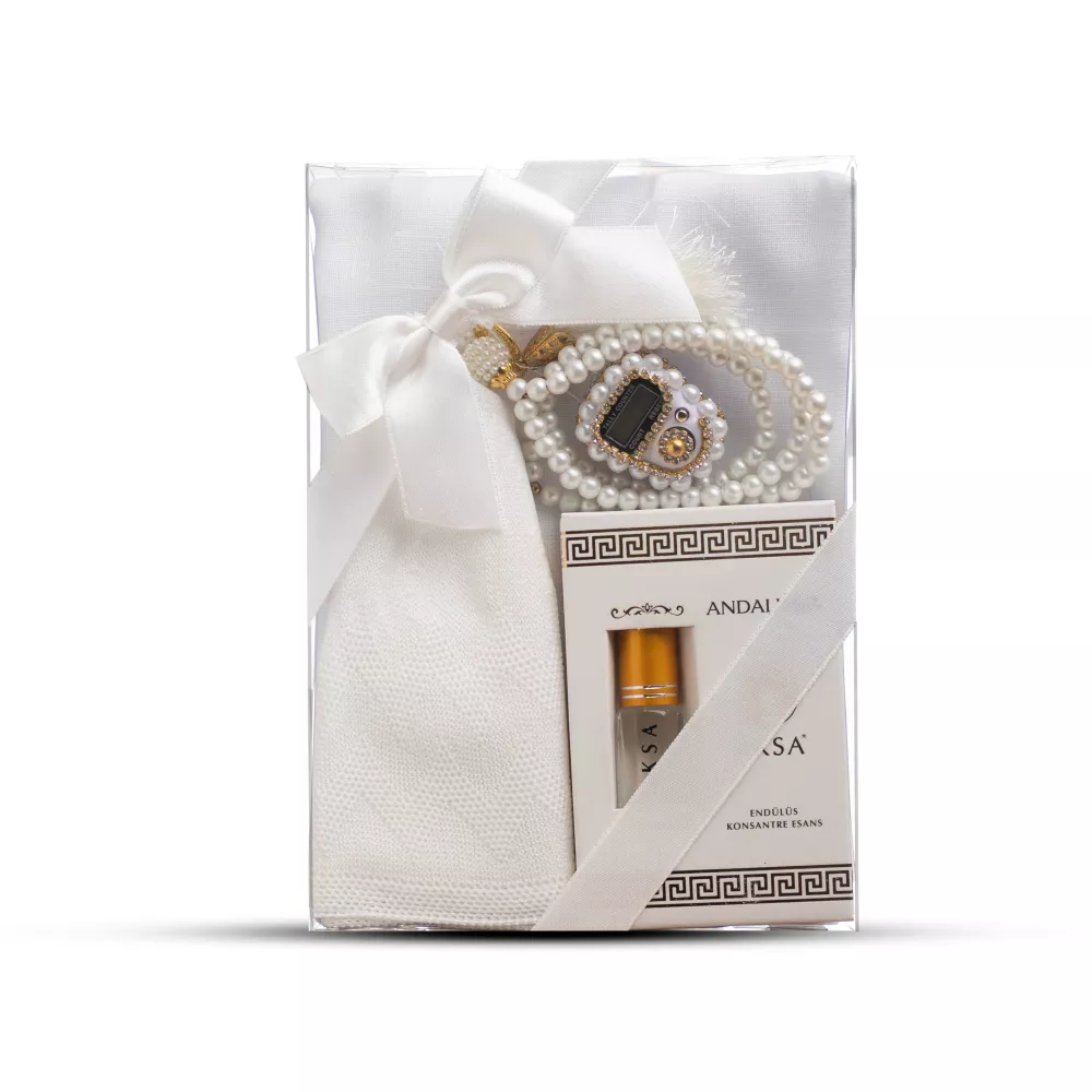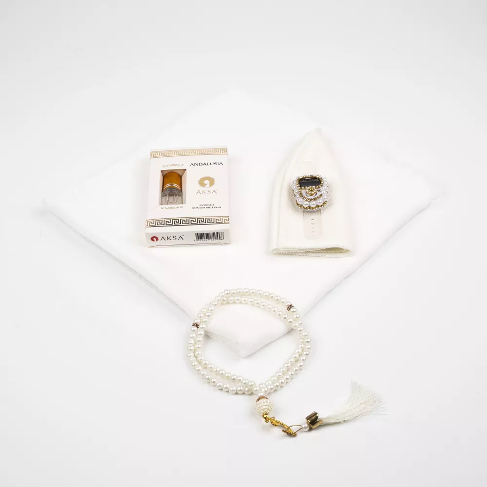 Eşarp + Takke + Esans + Tesbih + Zikirmatik Hediye Seti (Asetat Kutulu, Beyaz)