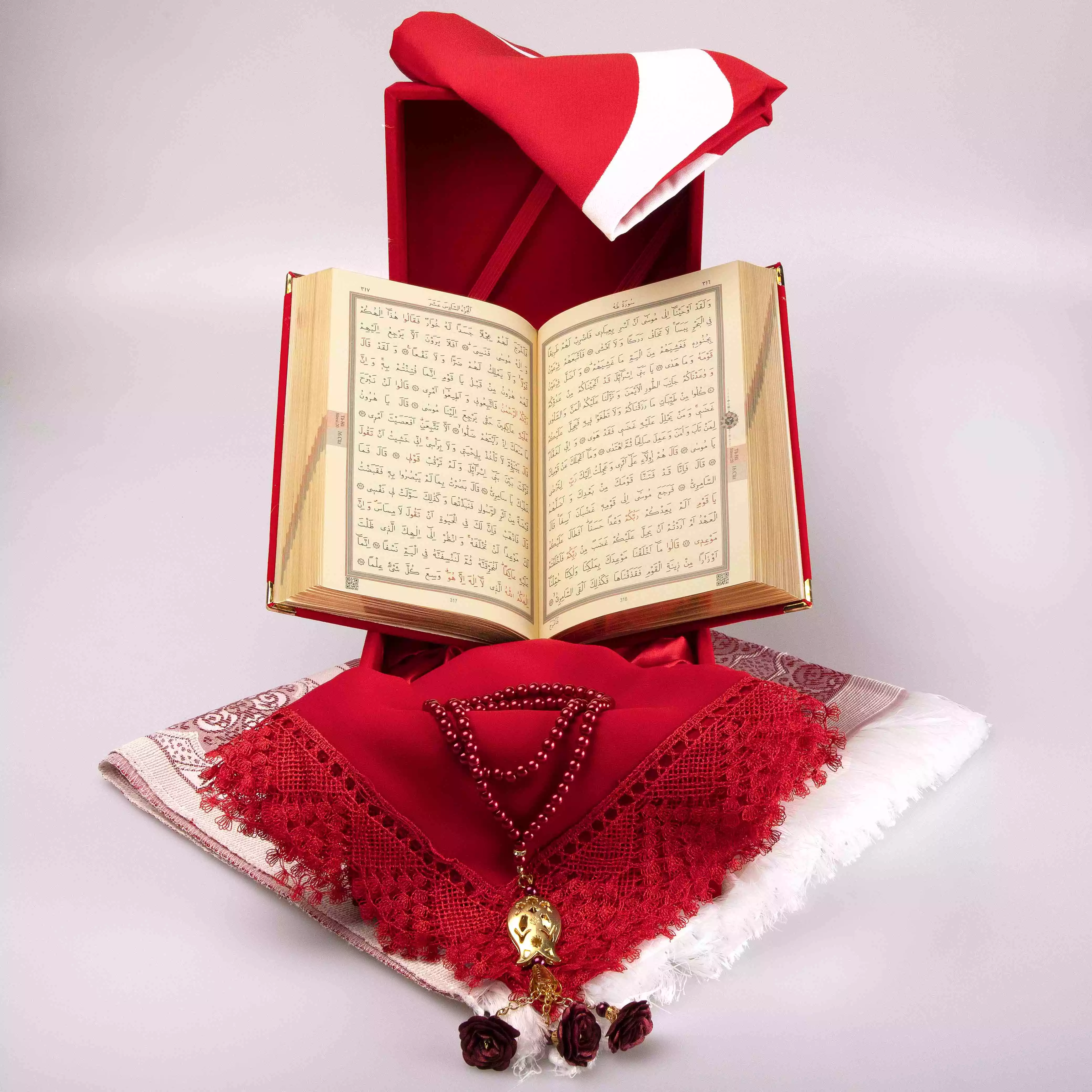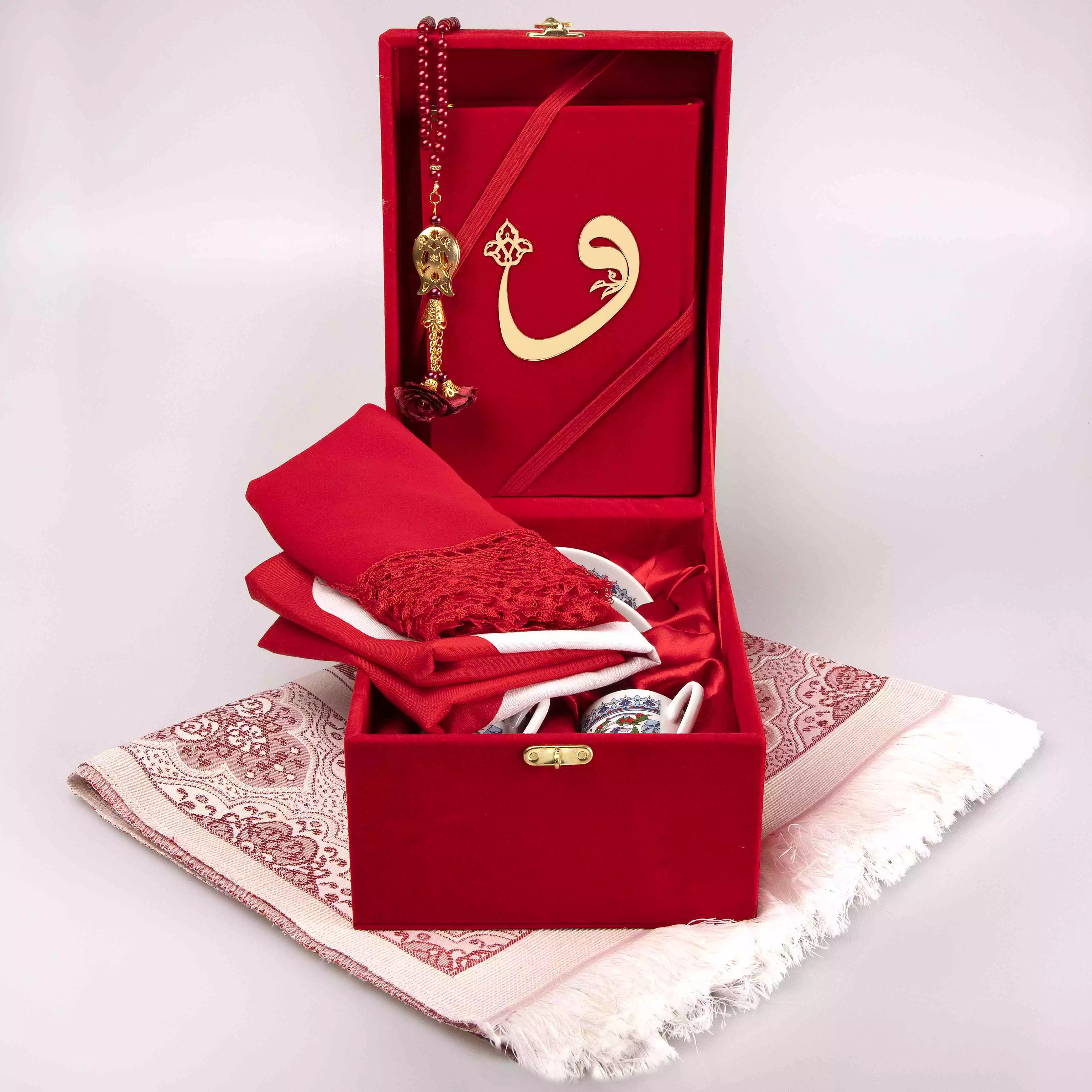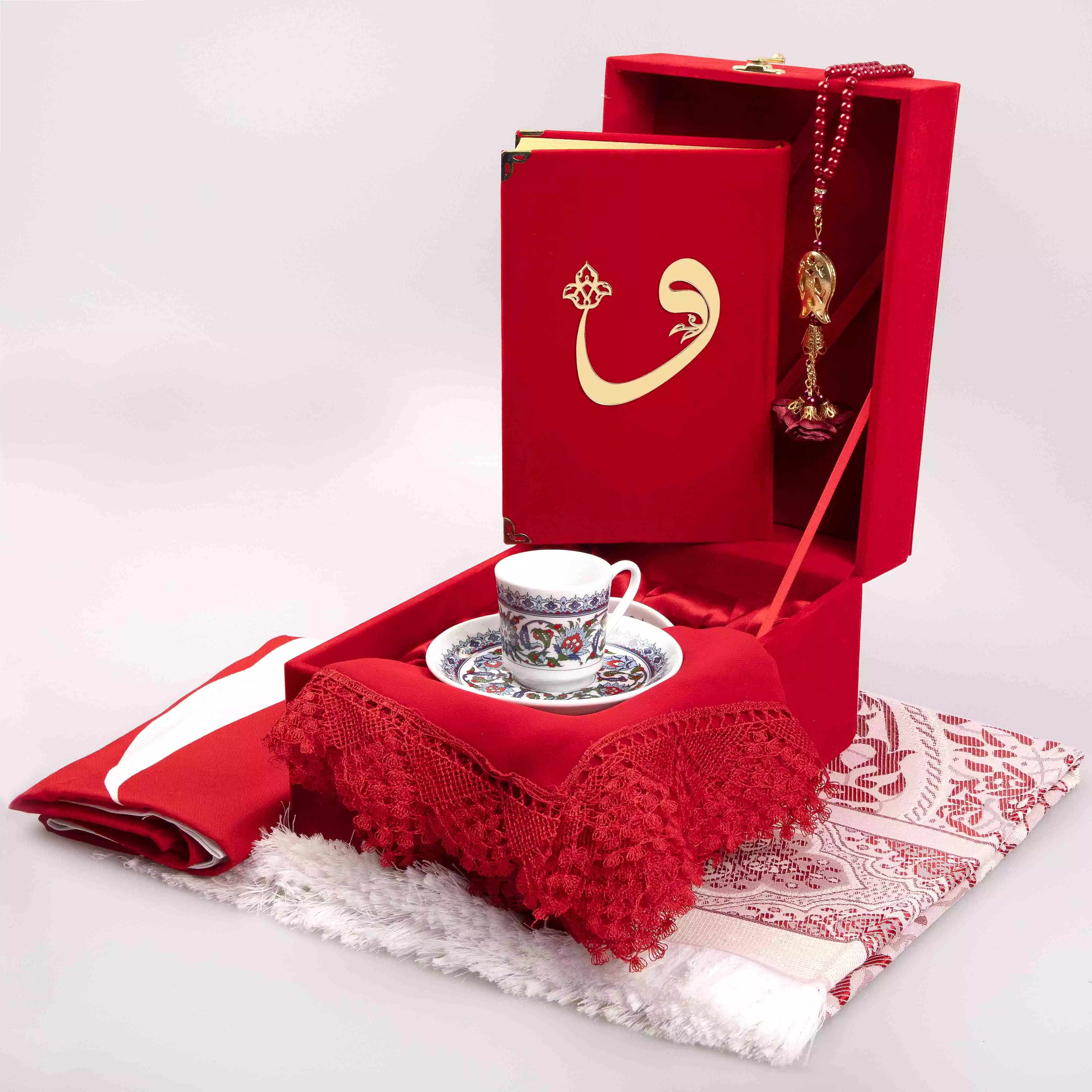 Bayrak + Fincan + Şal + Seccade + Tesbih + Kuran Hediye Seti (Hafız Boy, Kırmızı, Vav Motifli)
