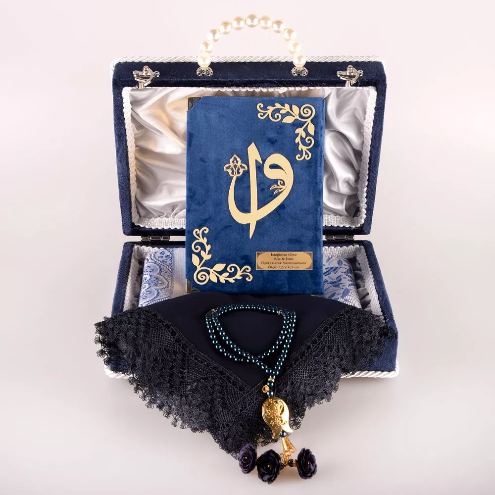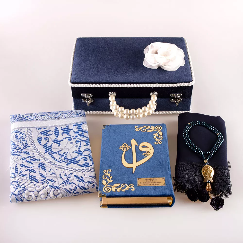 Boncuklu Kutu Çeyizlik, Şal + Seccade + Tesbih + Kuran Hediye Seti (Hafız B. Kadife, Lacivert)
