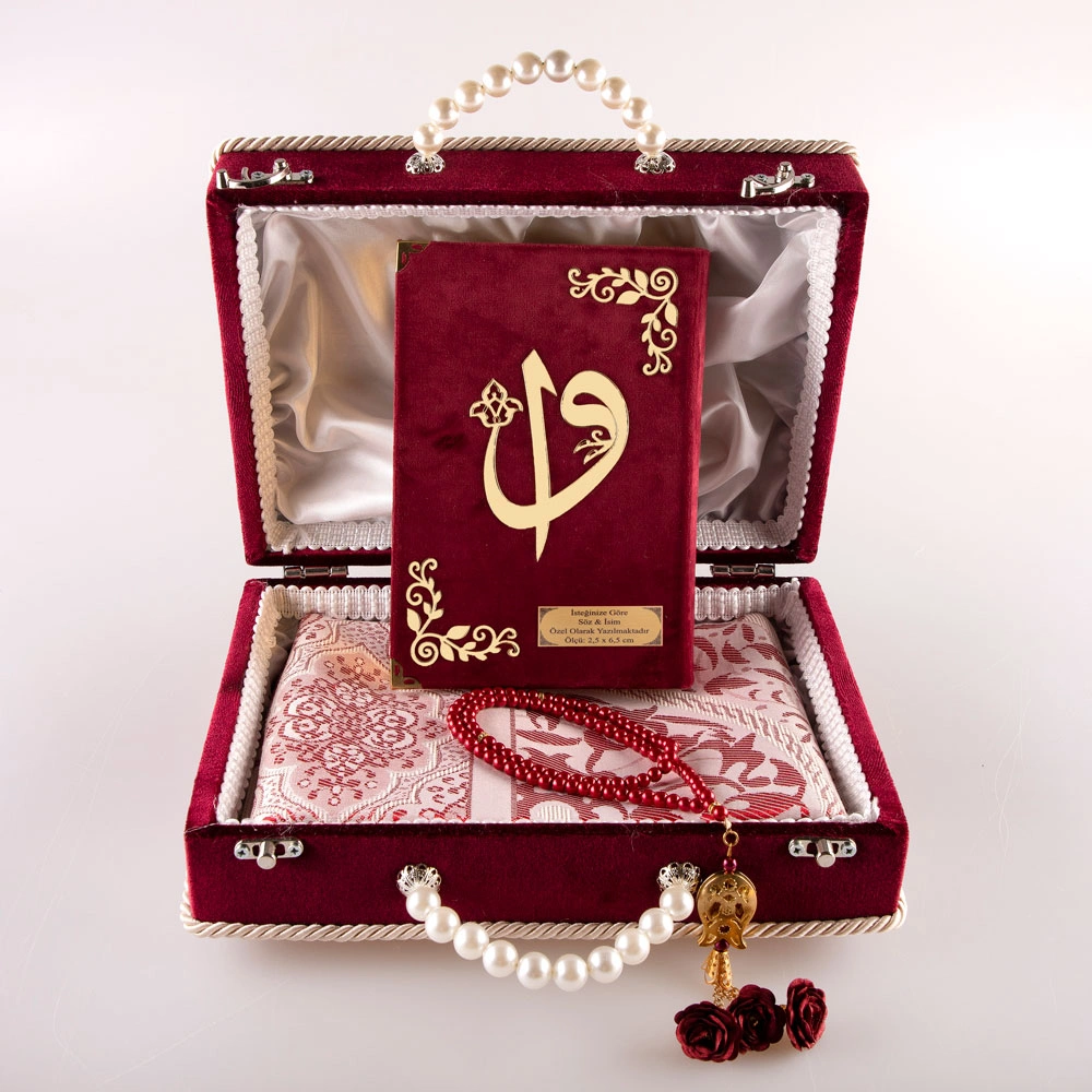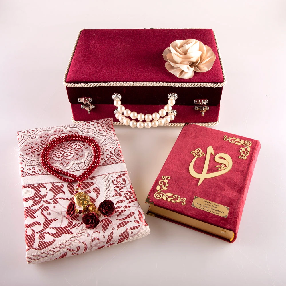 Boncuklu Kutu Çeyizlik, Seccade + Tesbih + Kuran Hediye Seti (Çanta Boy, Bordo)
