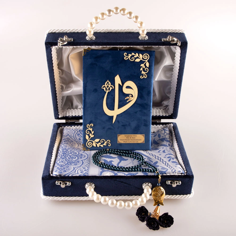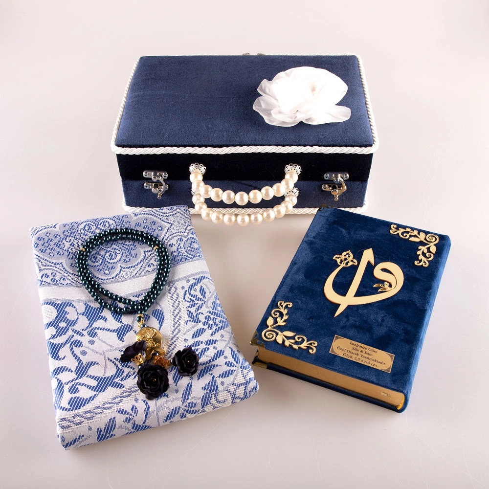 Boncuklu Kutu Çeyizlik, Seccade + Tesbih + Kuran Hediye Seti (Çanta Boy, Lacivert)