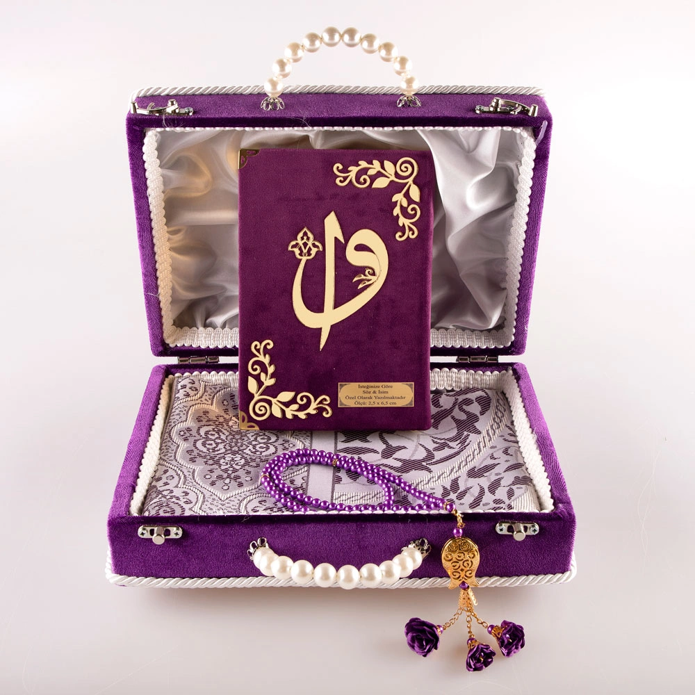 Boncuklu Kutu Çeyizlik, Seccade + Tesbih + Kuran Hediye Seti (Çanta Boy, Mor)