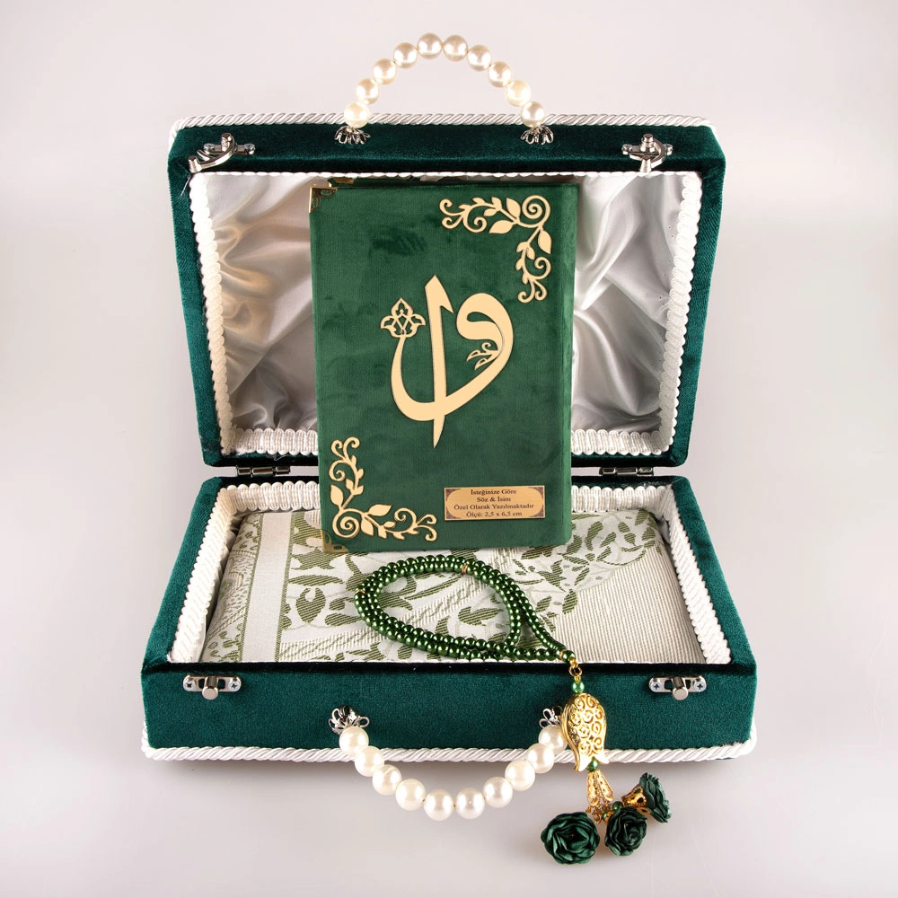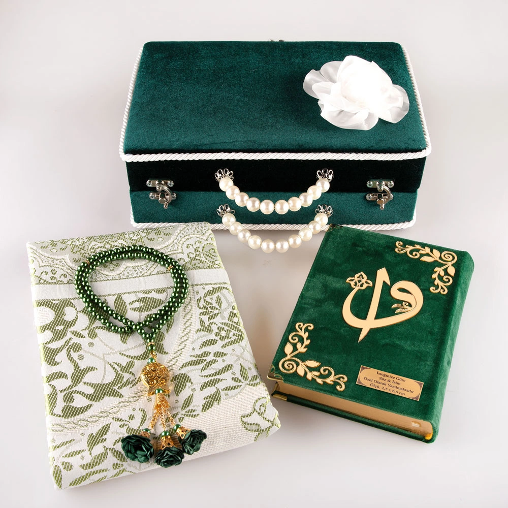 Boncuklu Kutu Çeyizlik, Seccade + Tesbih + Kuran Hediye Seti (Çanta Boy, Yeşil)