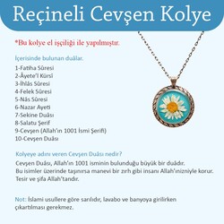 AÇIKLAMAEl işçiğiyle özenle yapılmış Madeni Bronz Reçine Kolye Cevşen, kurutulmuş gerçek çiçek ve gerçek ebrulu desenleriyle sevdikleriniz için çok güzel bir hediye.