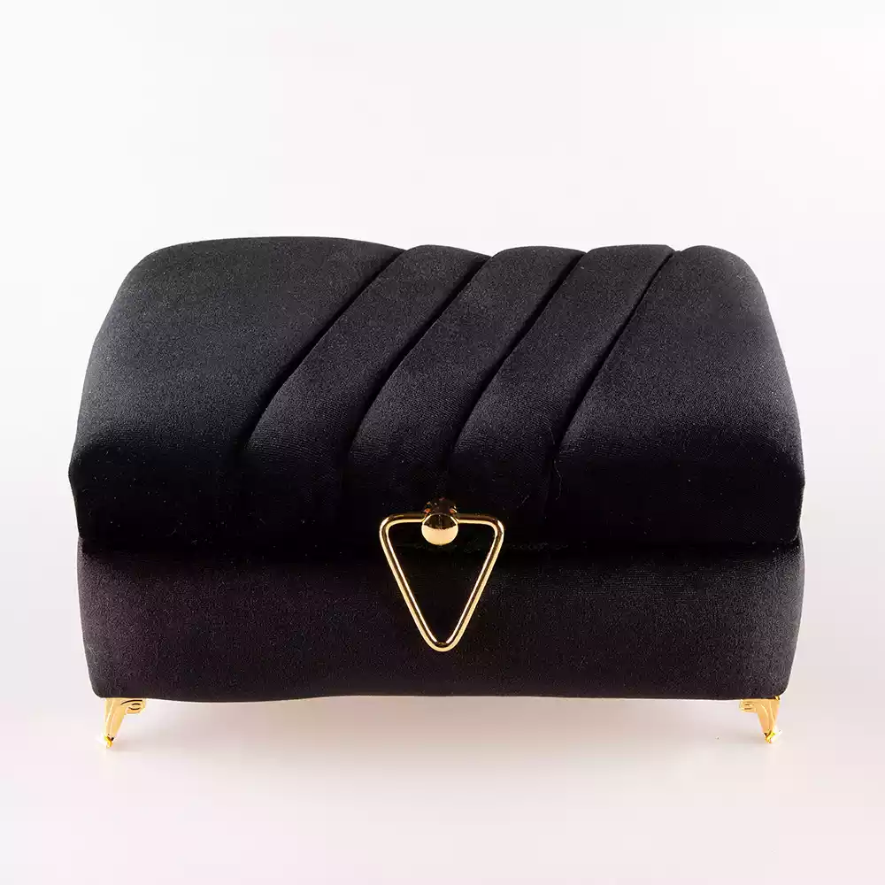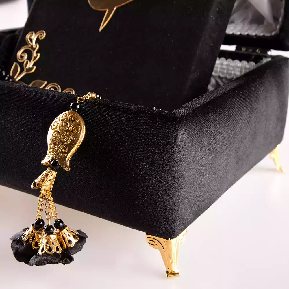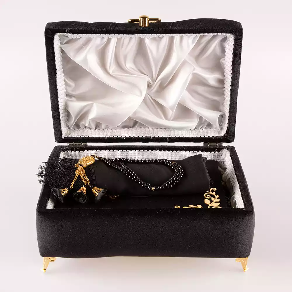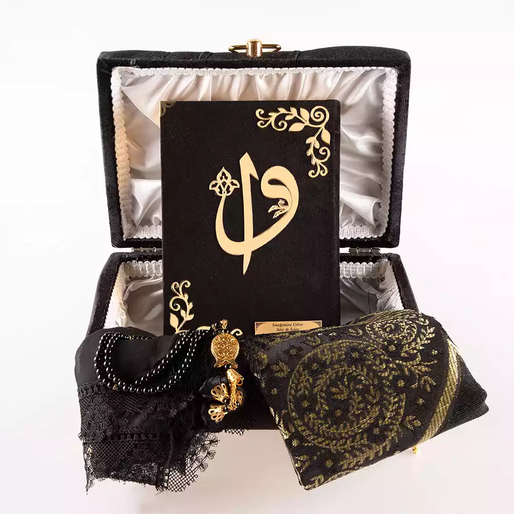 Çizgili Kutu Çeyizlik, Şal + Seccade + Tesbih + Kuran Hediye Seti (Çanta B. Kadife, Siyah, Elif-Vav)