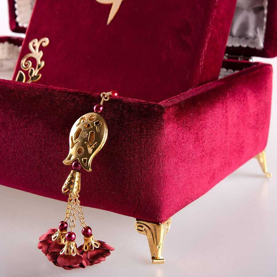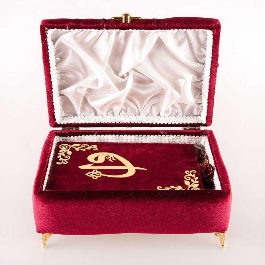 Çizgili Kutu Çeyizlik, Seccade + Tesbih + Kuran Hediye Seti (Hafız Boy, Kadife, Bordo, Elif-Vav)