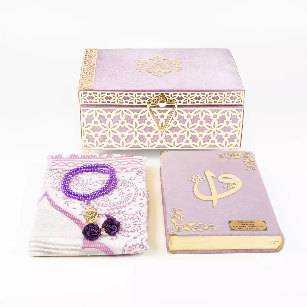 Desenli Kutu Çeyizlik, Seccade + Tesbih + Kuran Hediye Seti (Çanta Boy, Kadife, Lila, Elif-Vav)