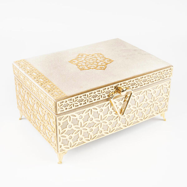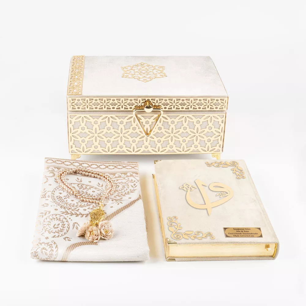 Desenli Kutu Çeyizlik, Seccade + Tesbih + Kuran Hediye Seti (Çanta Boy, Kadife, Vizon, Elif-Vav)