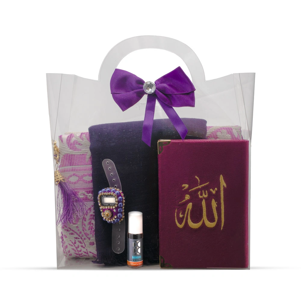 Eşarp + Esans + Tesbih + Zikirmatik + Büyük Cep Boy Kadife Kuran Seti (Nakışlı, Mor)