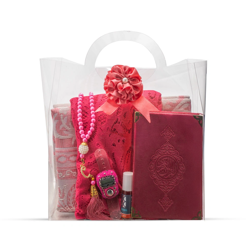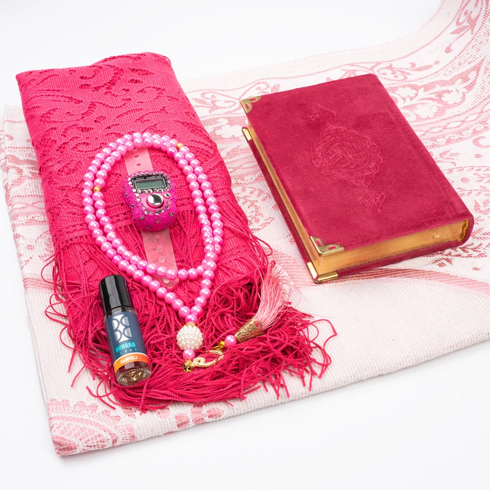 Eşarp + Esans + Tesbih + Zikirmatik + Büyük Cep Boy Kadife Kuran Seti (Soğuk Baskı, Fuşya)