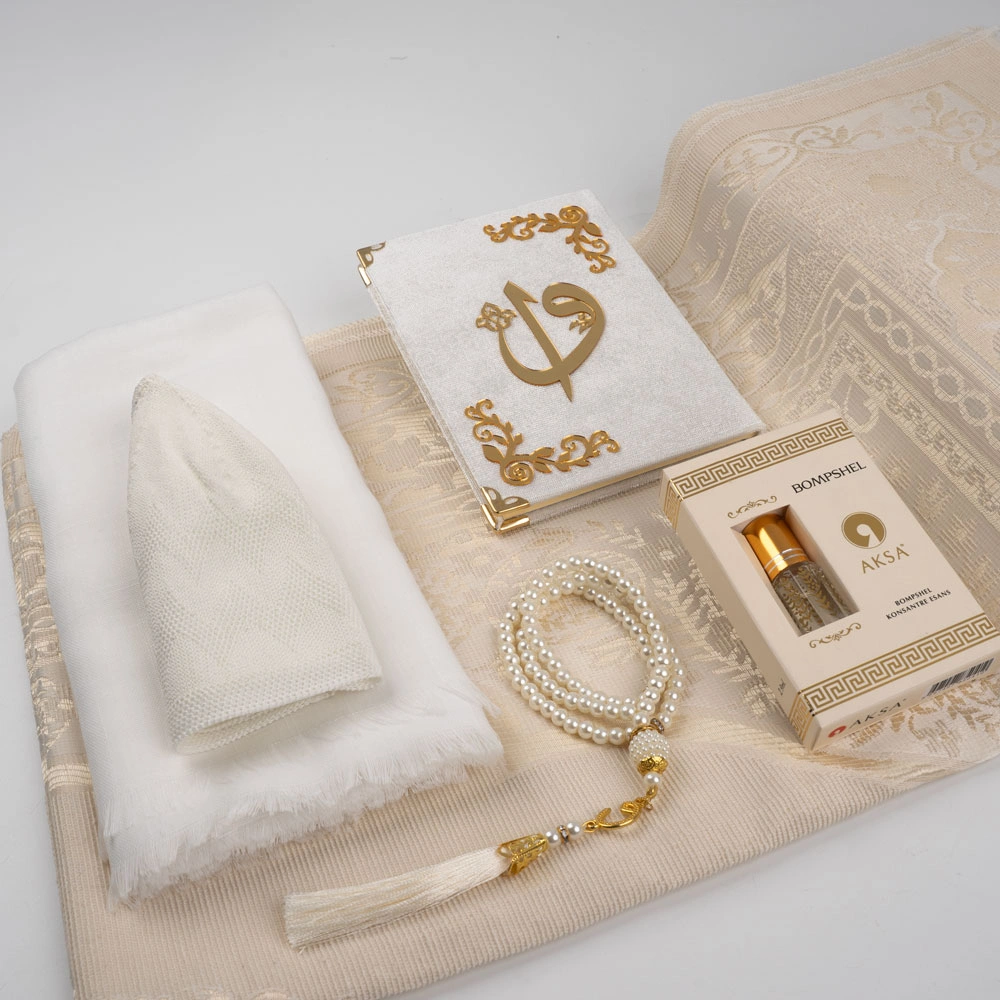 Eşarp + Takke + Seccade + Tesbih + Esans + Raşel Yasin Hediye Seti (Çanta Boy, Krem)