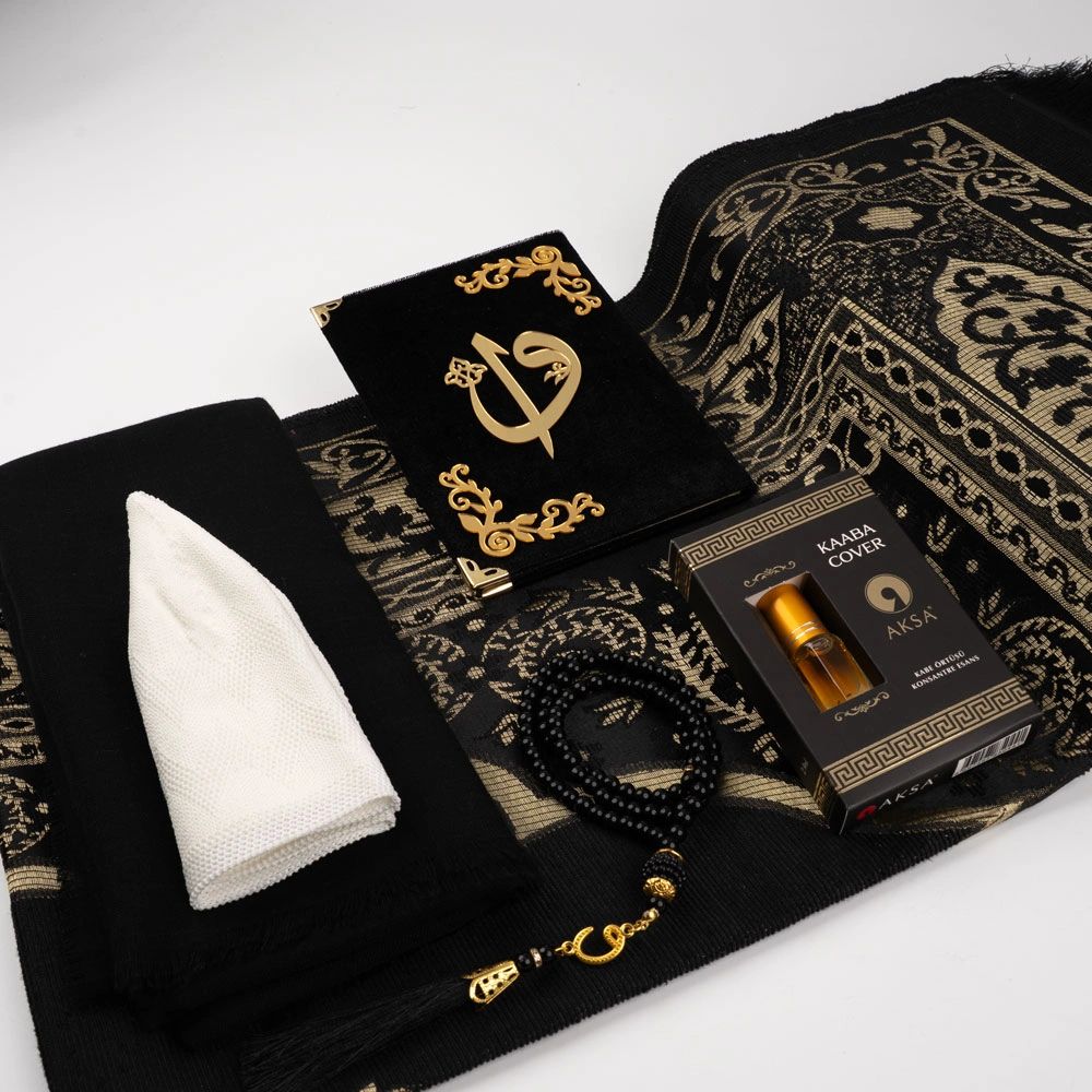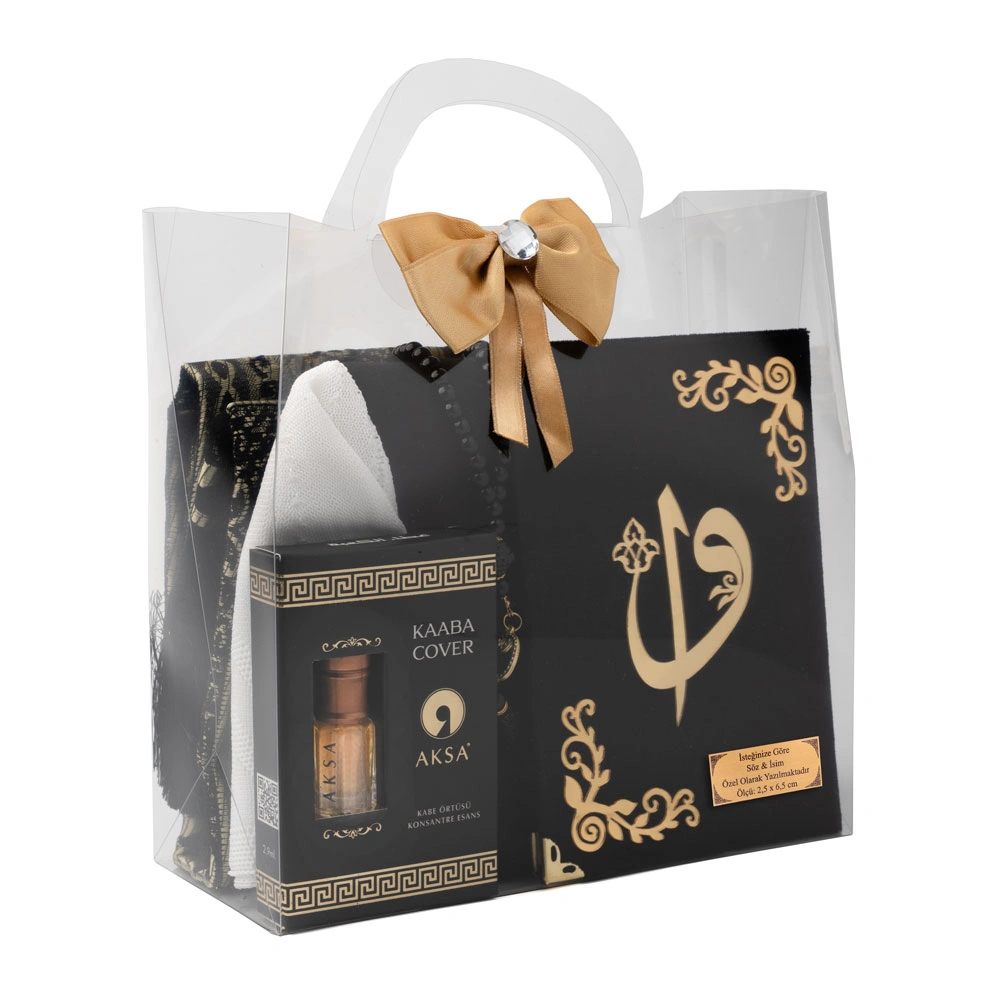 Eşarp + Takke + Seccade + Tesbih + Esans + Raşel Yasin Hediye Seti (Çanta Boy, Siyah)