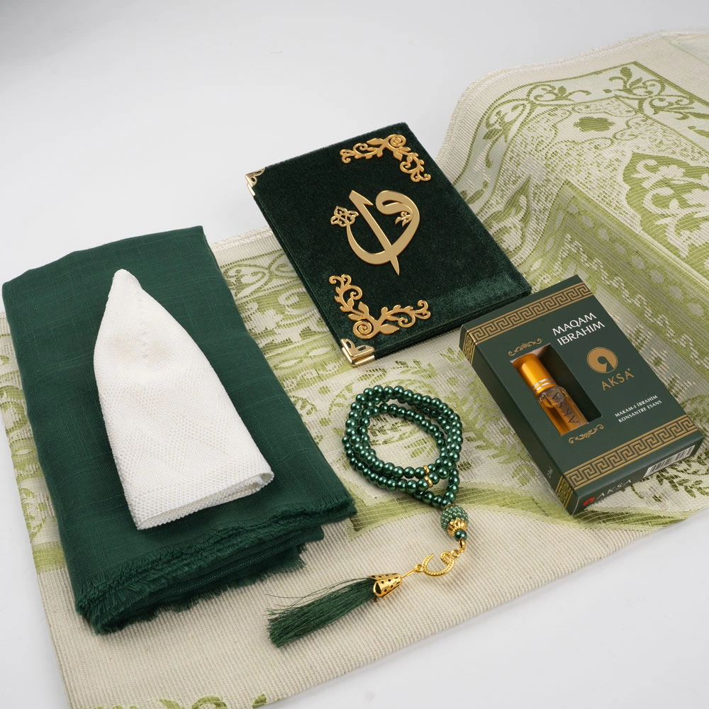 Eşarp + Takke + Seccade + Tesbih + Esans + Raşel Yasin Hediye Seti (Çanta Boy, Yeşil)