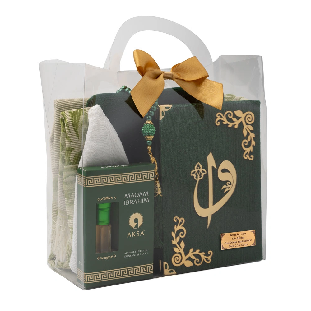 Eşarp + Takke + Seccade + Tesbih + Zikirmatik + Esans + Raşel Yasin Hediye Seti (Çanta Boy, Yeşil)