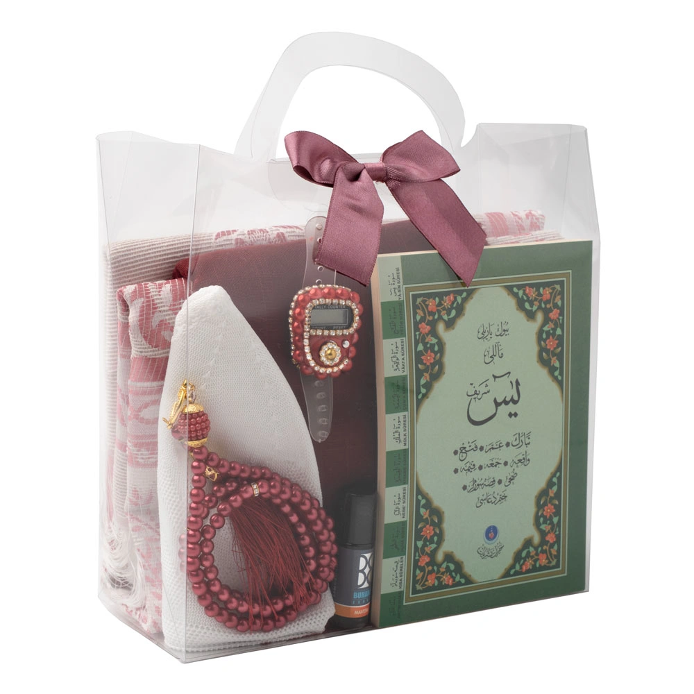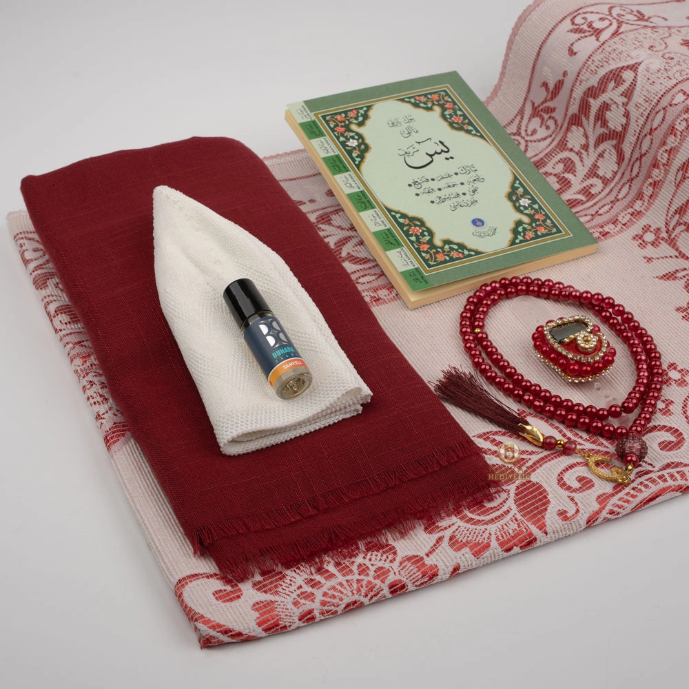 Eşarp + Takke + Seccade + Tesbih + Zikirmatik + Esans + Yasin Hediye Seti (Çanta Boy, Bordo)