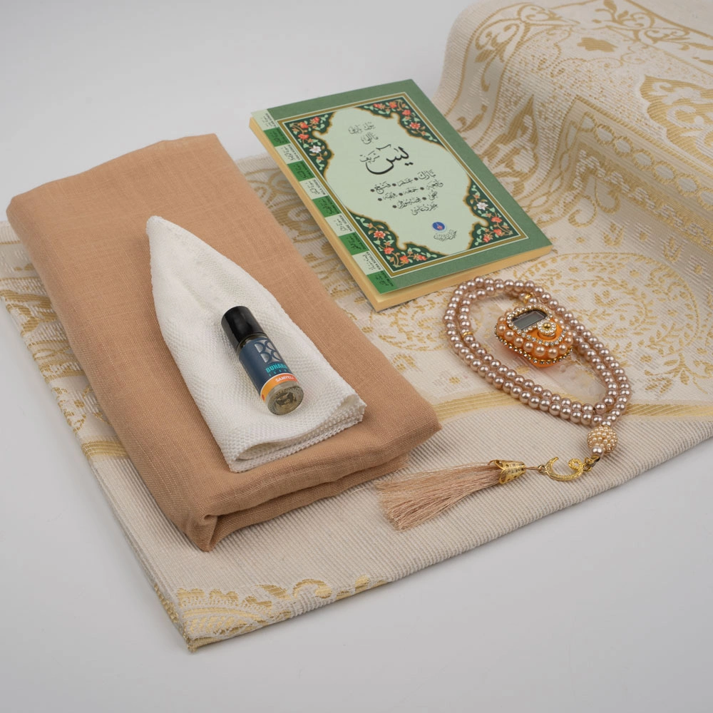 Eşarp + Takke + Seccade + Tesbih + Zikirmatik + Esans + Yasin Hediye Seti (Çanta Boy, Gold)