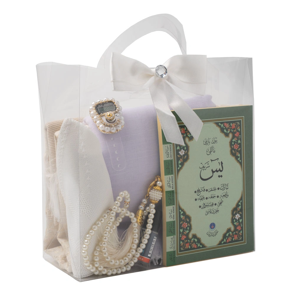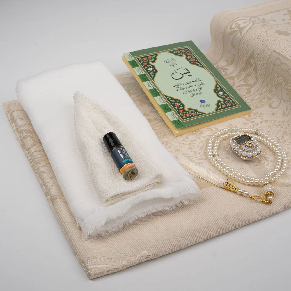 Eşarp + Takke + Seccade + Tesbih + Zikirmatik + Esans + Yasin Hediye Seti (Çanta Boy, Krem)