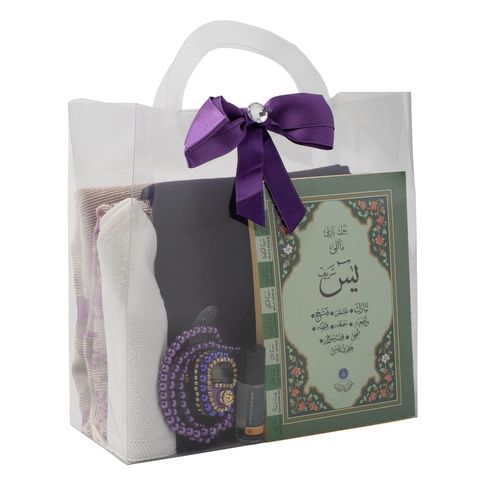 Eşarp + Takke + Seccade + Tesbih + Zikirmatik + Esans + Yasin Hediye Seti (Çanta Boy, Mor)