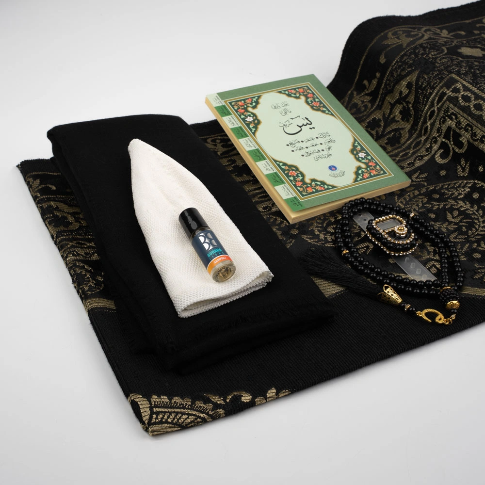 Eşarp + Takke + Seccade + Tesbih + Zikirmatik + Esans + Yasin Hediye Seti (Çanta Boy, Siyah)