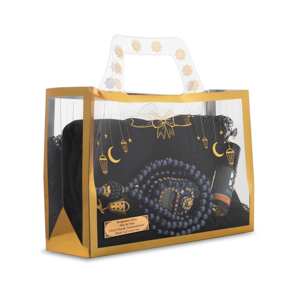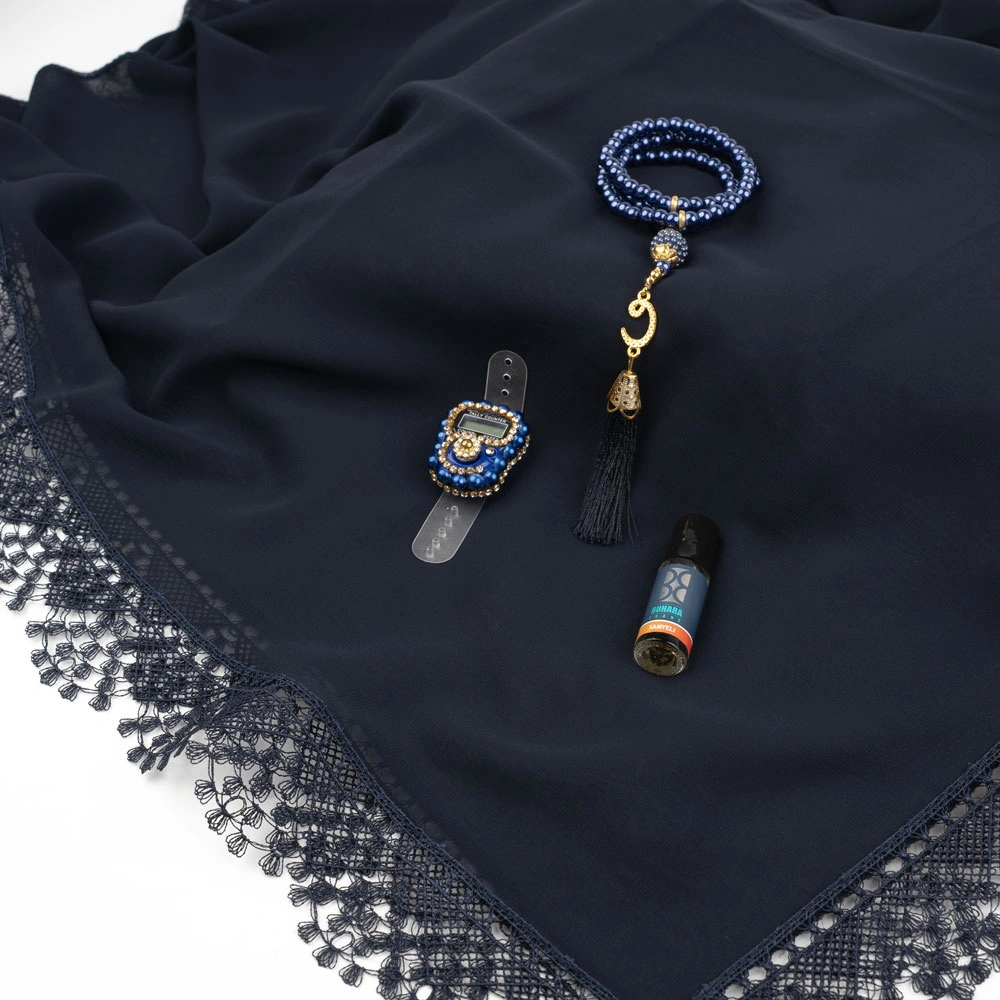 İğne Oyalı Şal + Tesbih + Zikirmatik + Esans Hediye Seti (Lacivert)