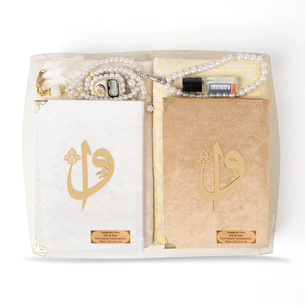 İkili Yasin + Seccade + Tesbih + Zikirmatik + Esans Hediye Seti (Krem-Gold, Çanta Boy, 99lu+33lü)