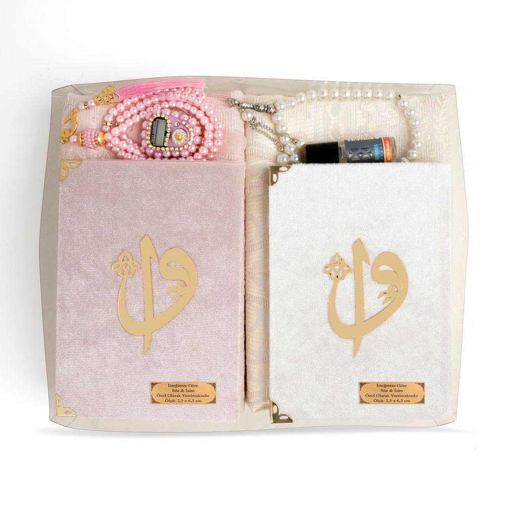 İkili Yasin + Seccade + Tesbih + Zikirmatik + Esans Hediye Seti (Pembe-Krem, Çanta Boy, 99lu+33lü)