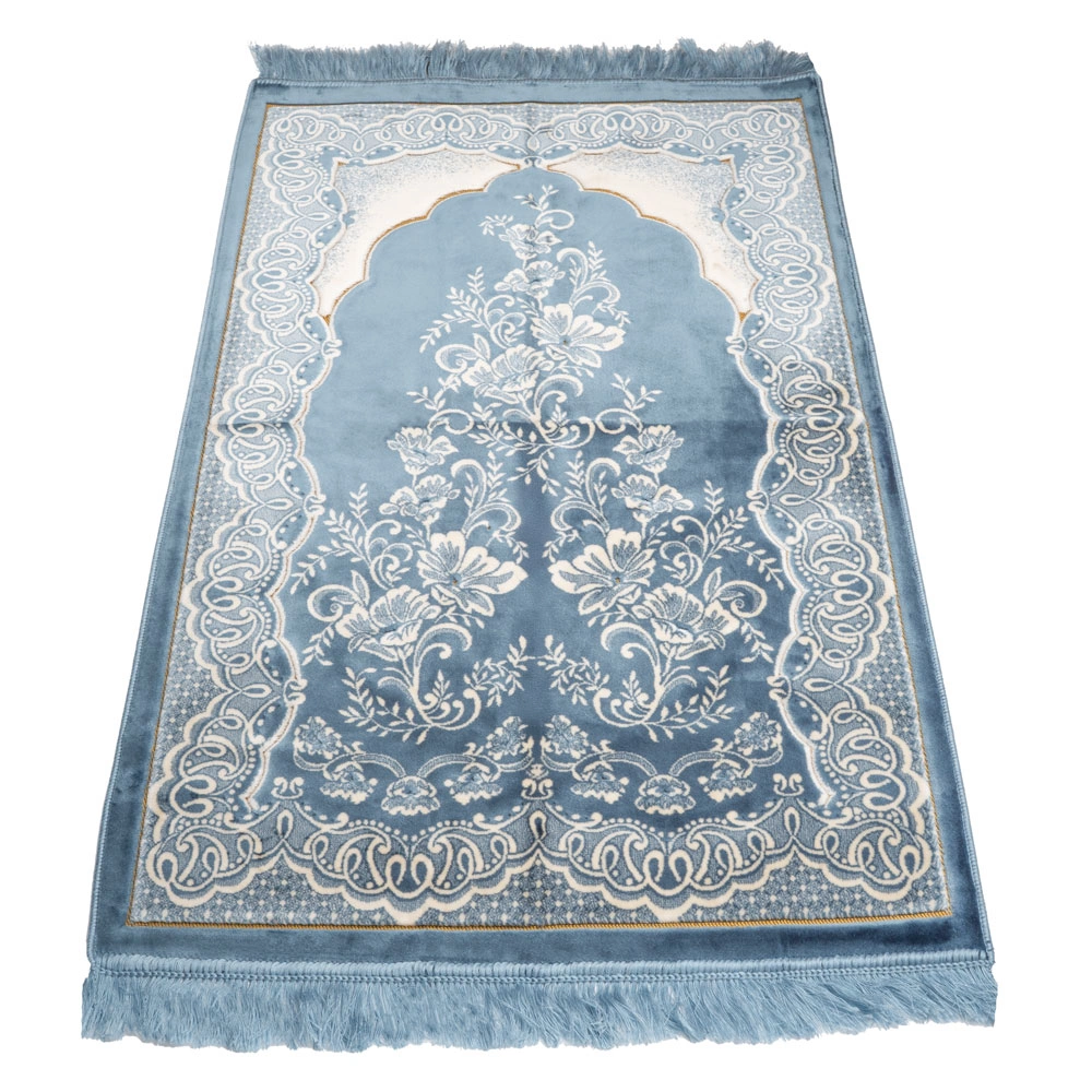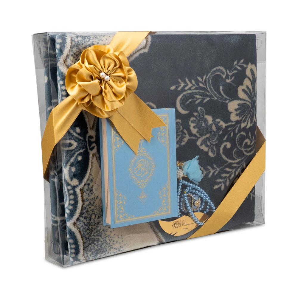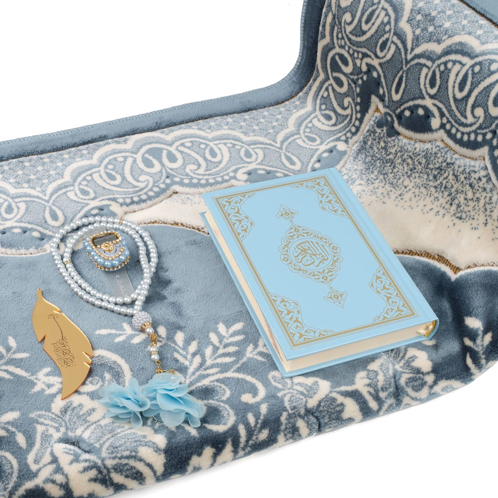 Kadife Seccade (120x80) + Tesbih + Zikirmatik + Ayraç + Çanta Boy Kuran Hediye Seti (Mavi)