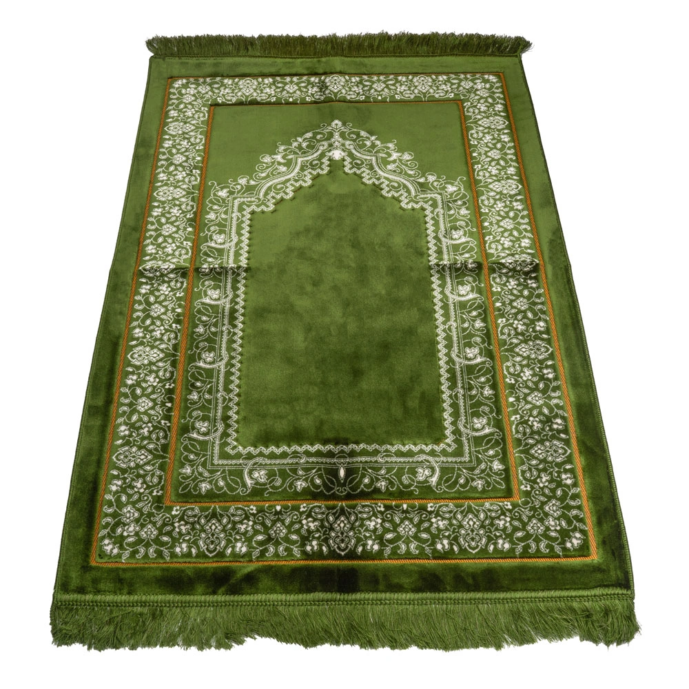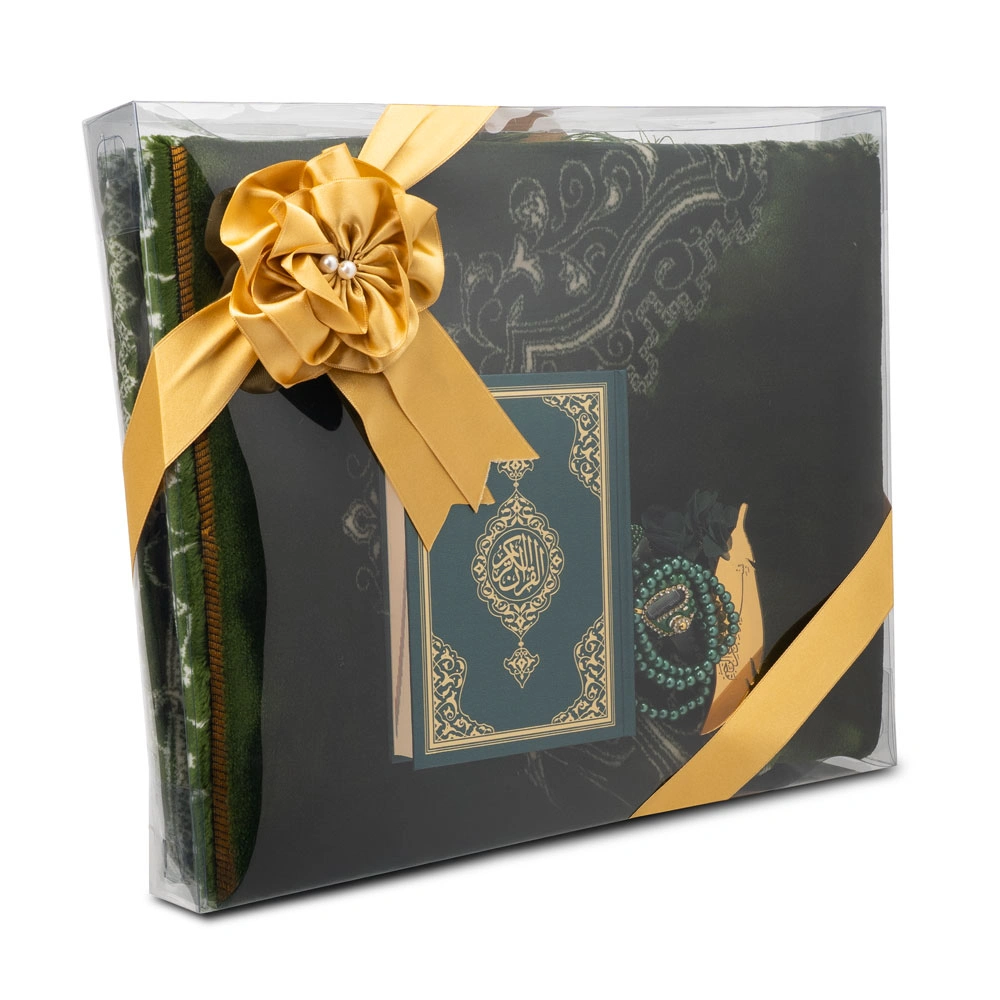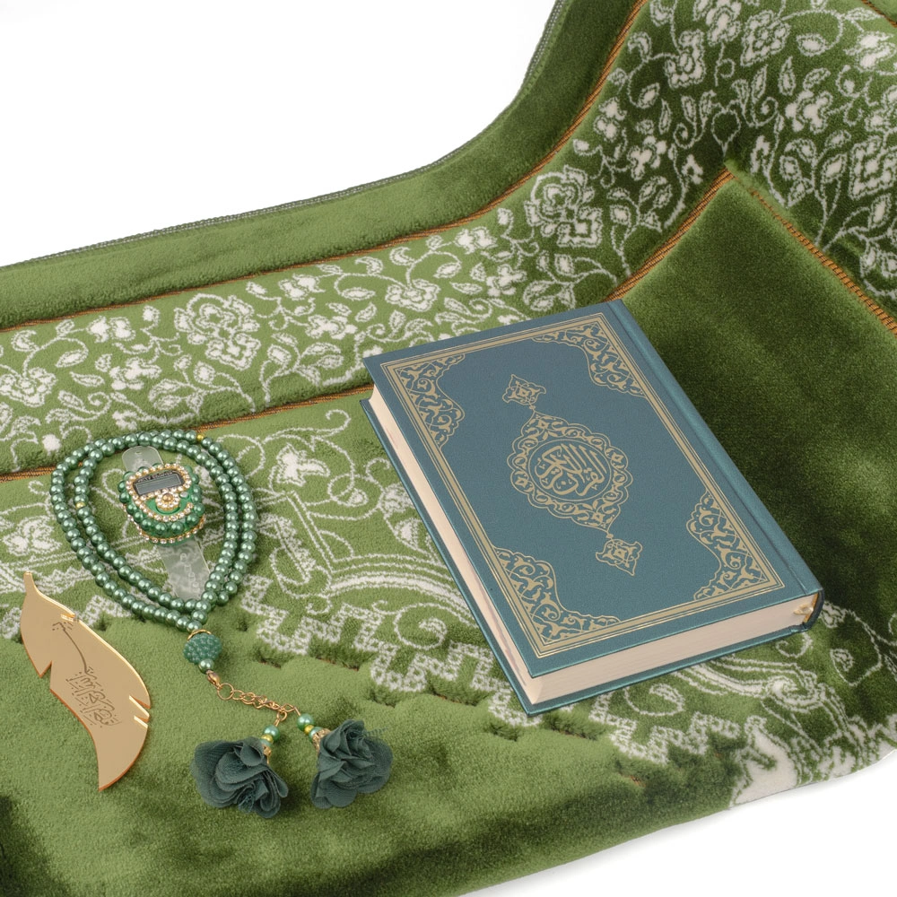 Kadife Seccade (120x80) + Tesbih + Zikirmatik + Ayraç + Çanta Boy Kuran Hediye Seti (Yeşil)