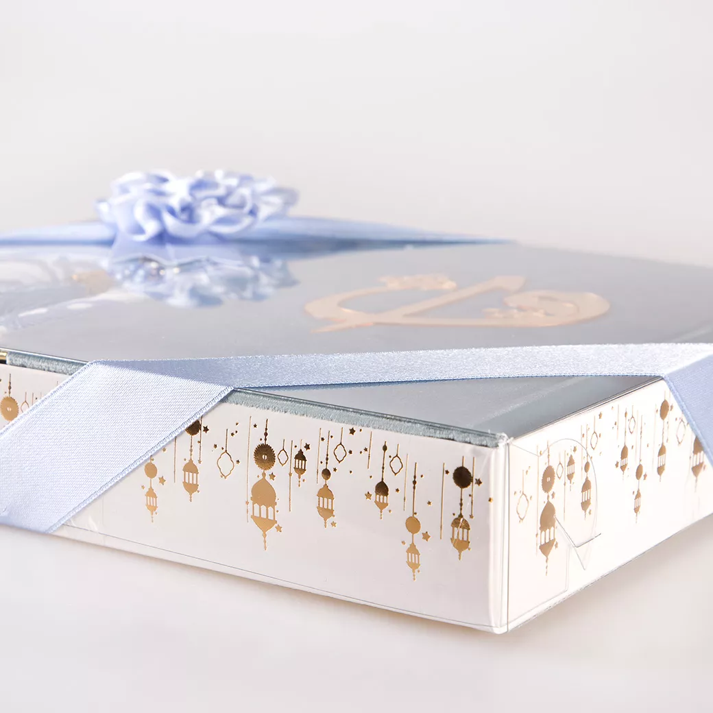 Kuran + Seccade + Tesbih Hediye Seti (Orta Boy, Kadife, Desenli Kutu, Açık Mavi)