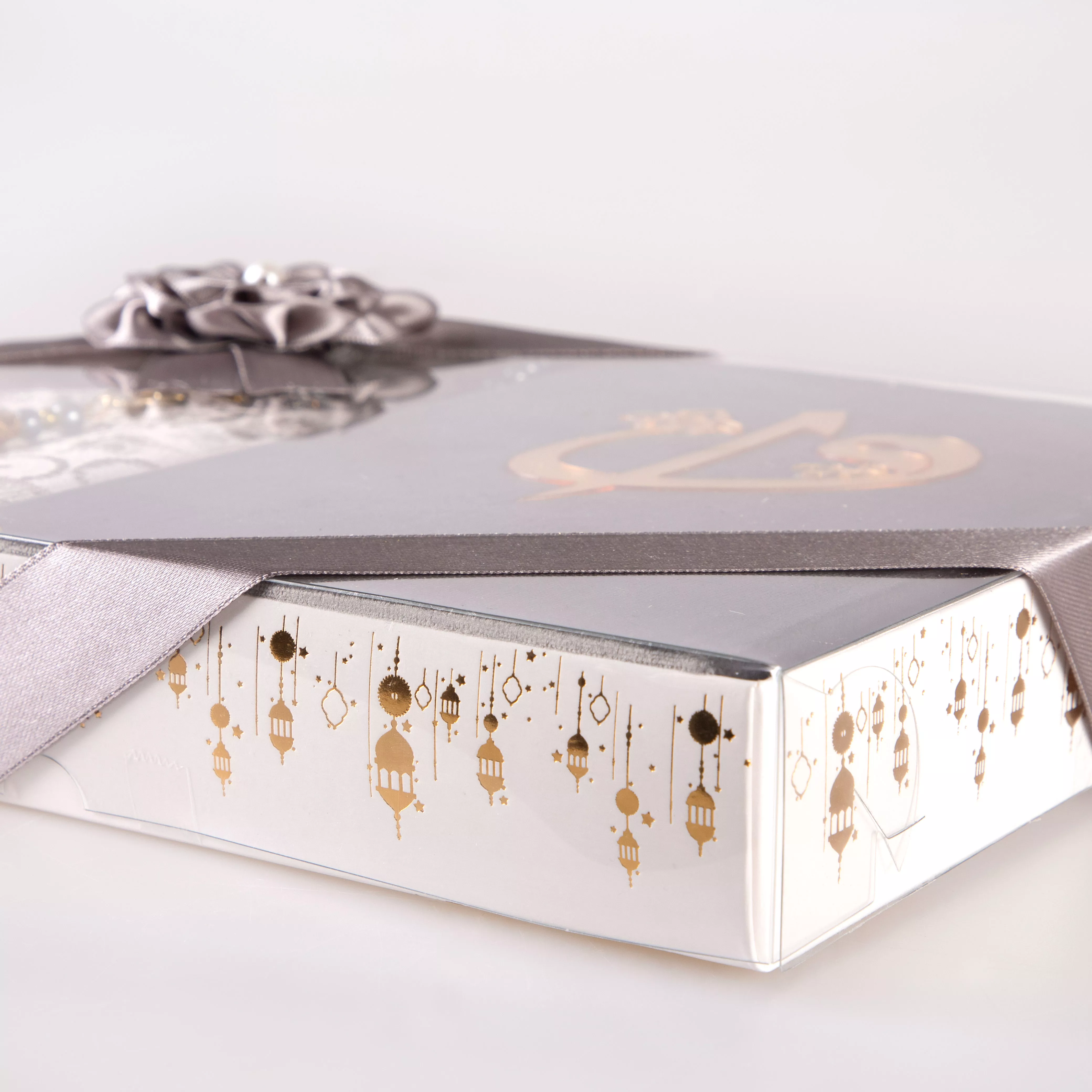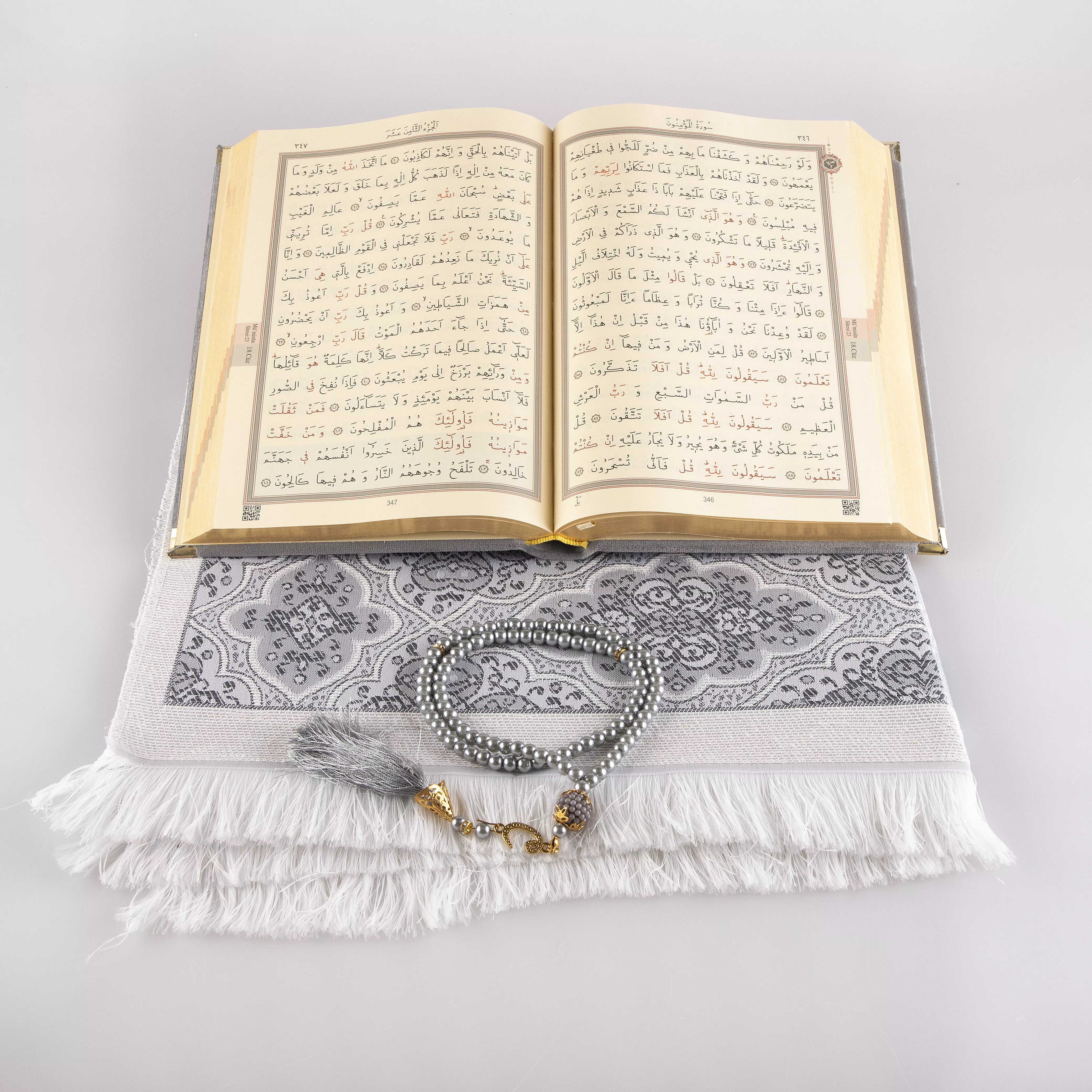 Kuran + Seccade + Tesbih Hediye Seti (Orta Boy, Kadife, Desenli Kutu, Gri)