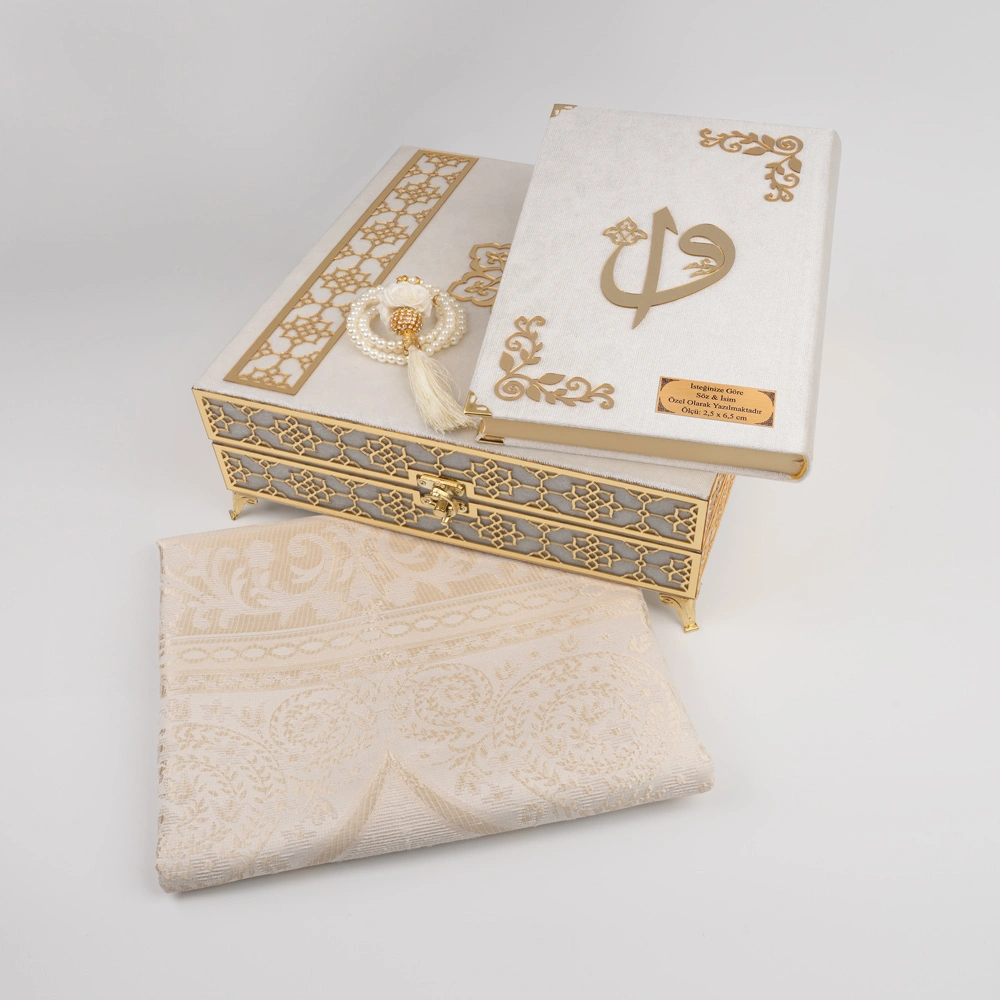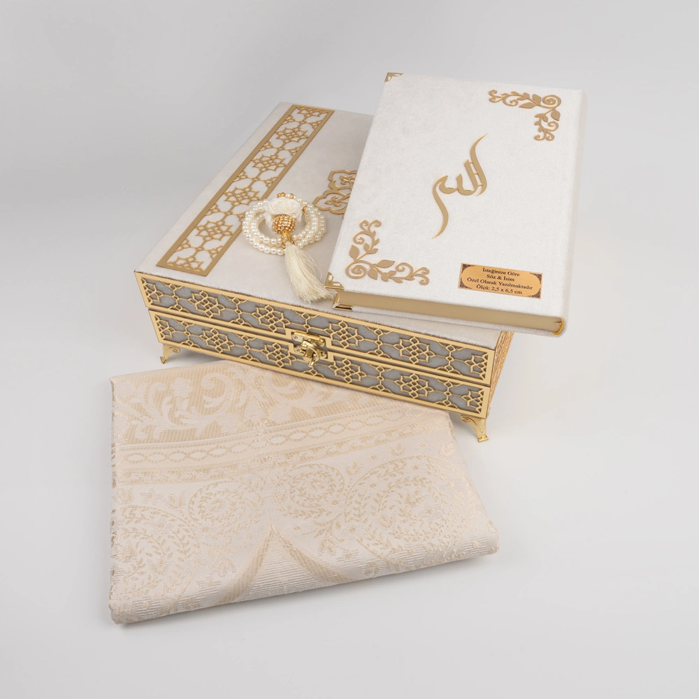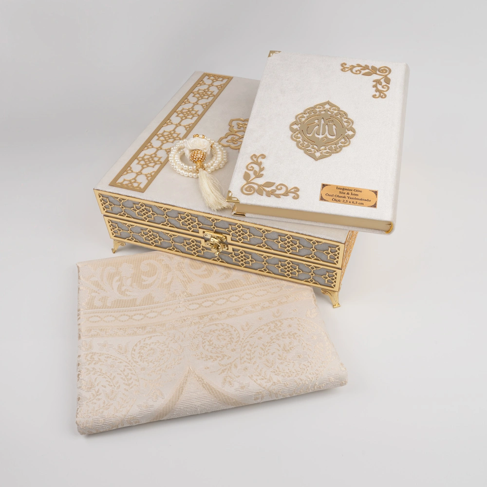Kuran + Seccade + Tesbih Hediye Seti (Orta Boy, Raşel Kare Kutu, Krem)