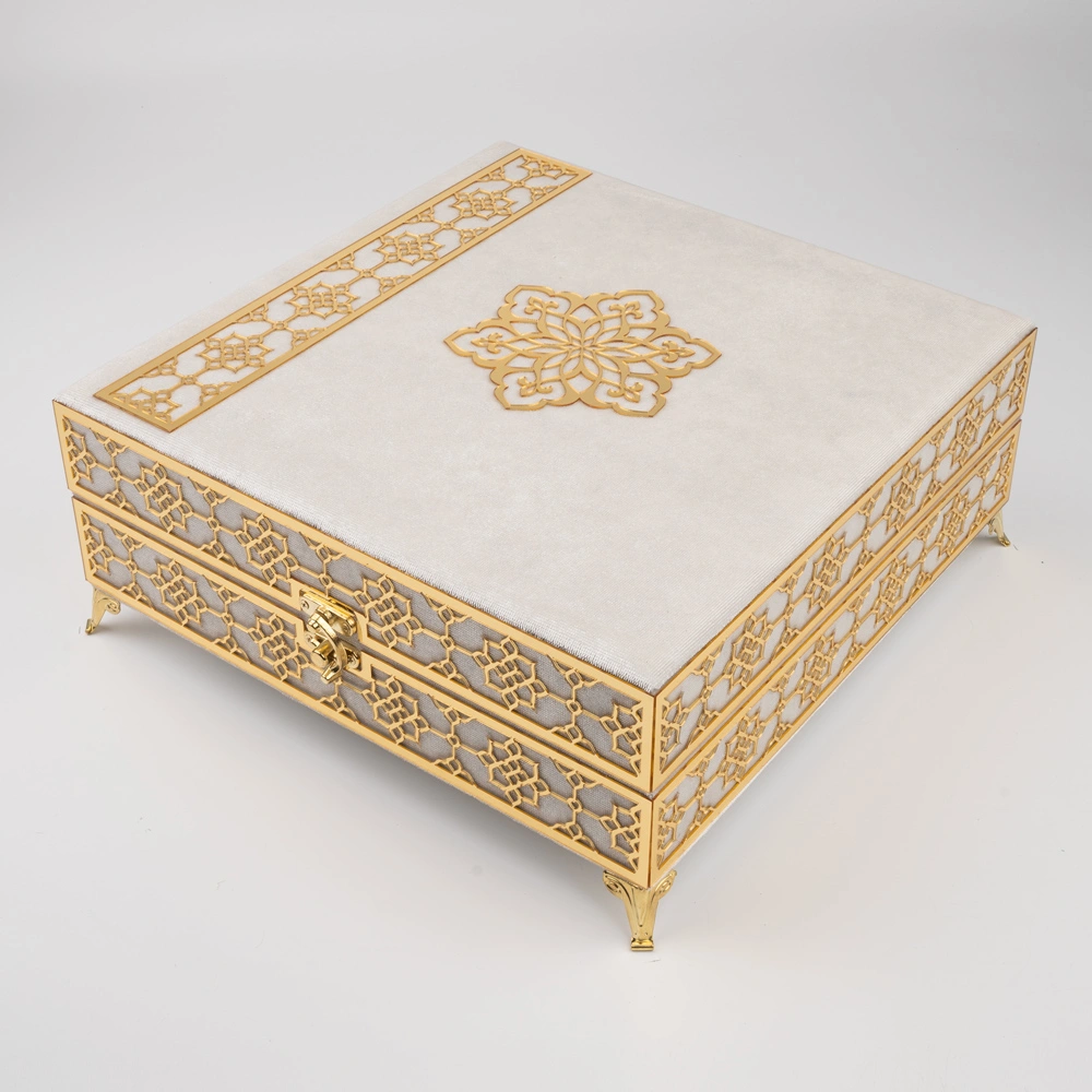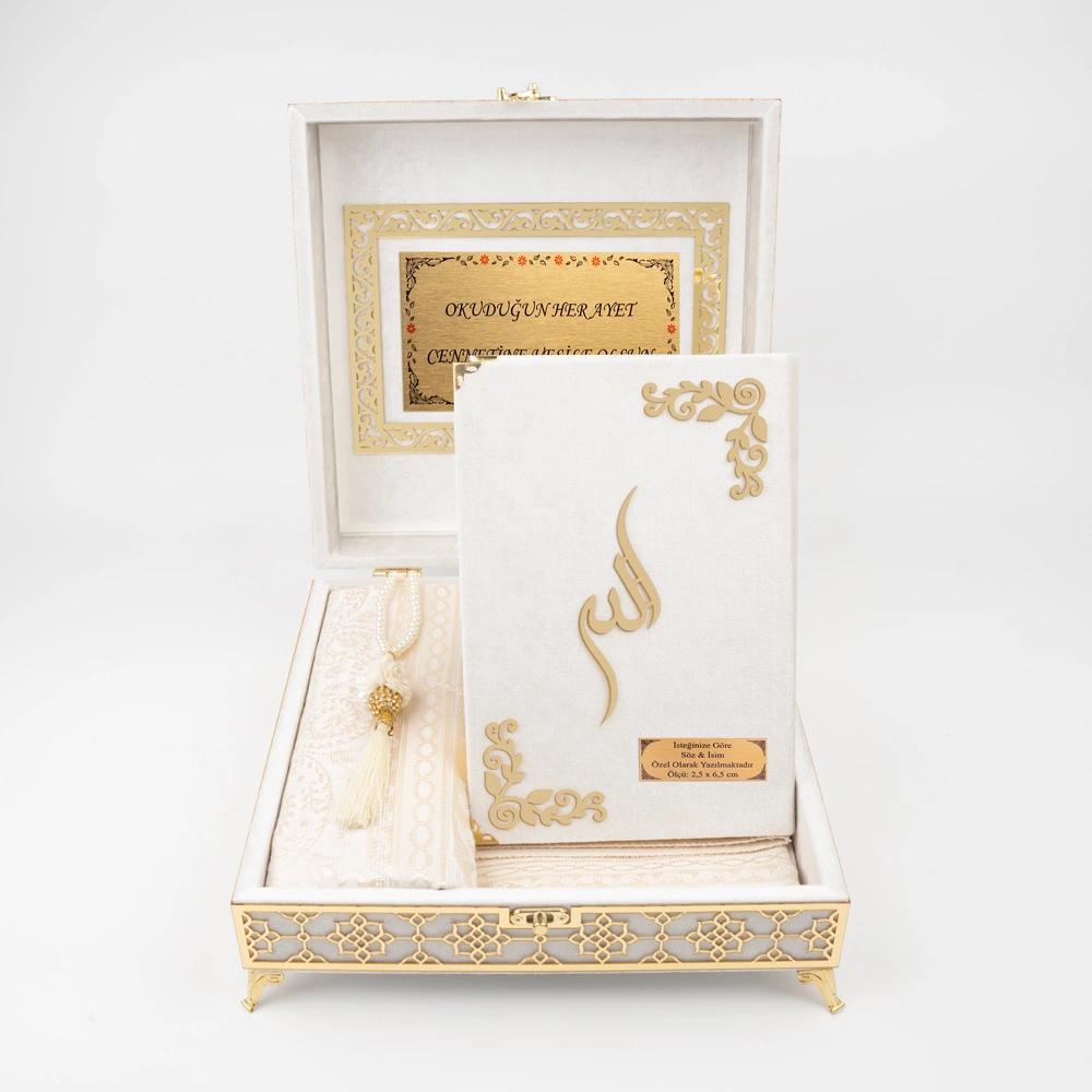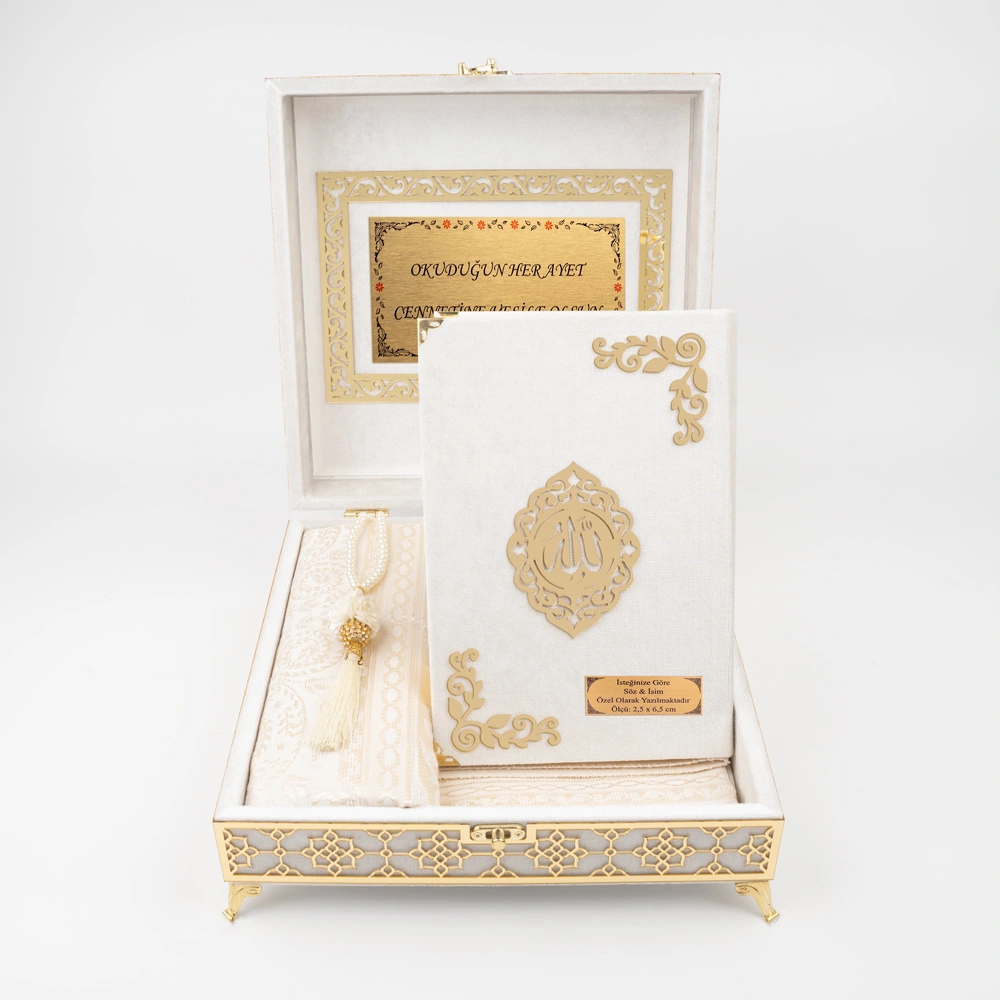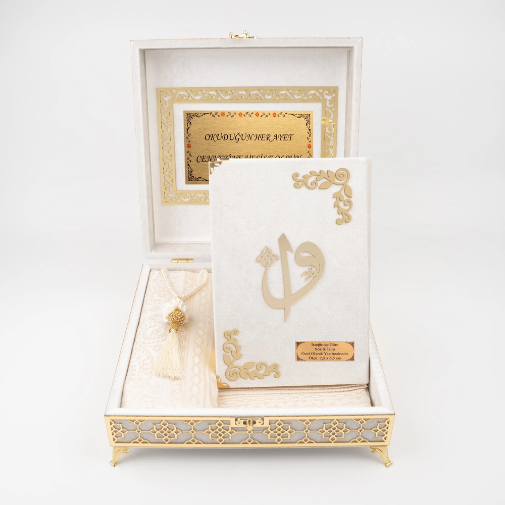 Kuran + Seccade + Tesbih Hediye Seti (Orta Boy, Raşel Kare Kutu, Krem)