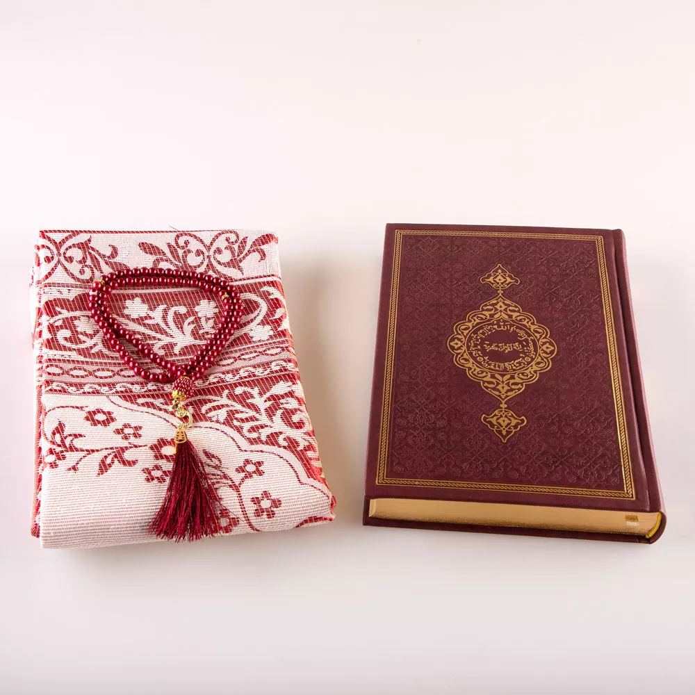 Kuran + Seccade + Tesbih Hediye Seti (Orta Boy, Termo Deri, Asetat Kutu, Bordo)