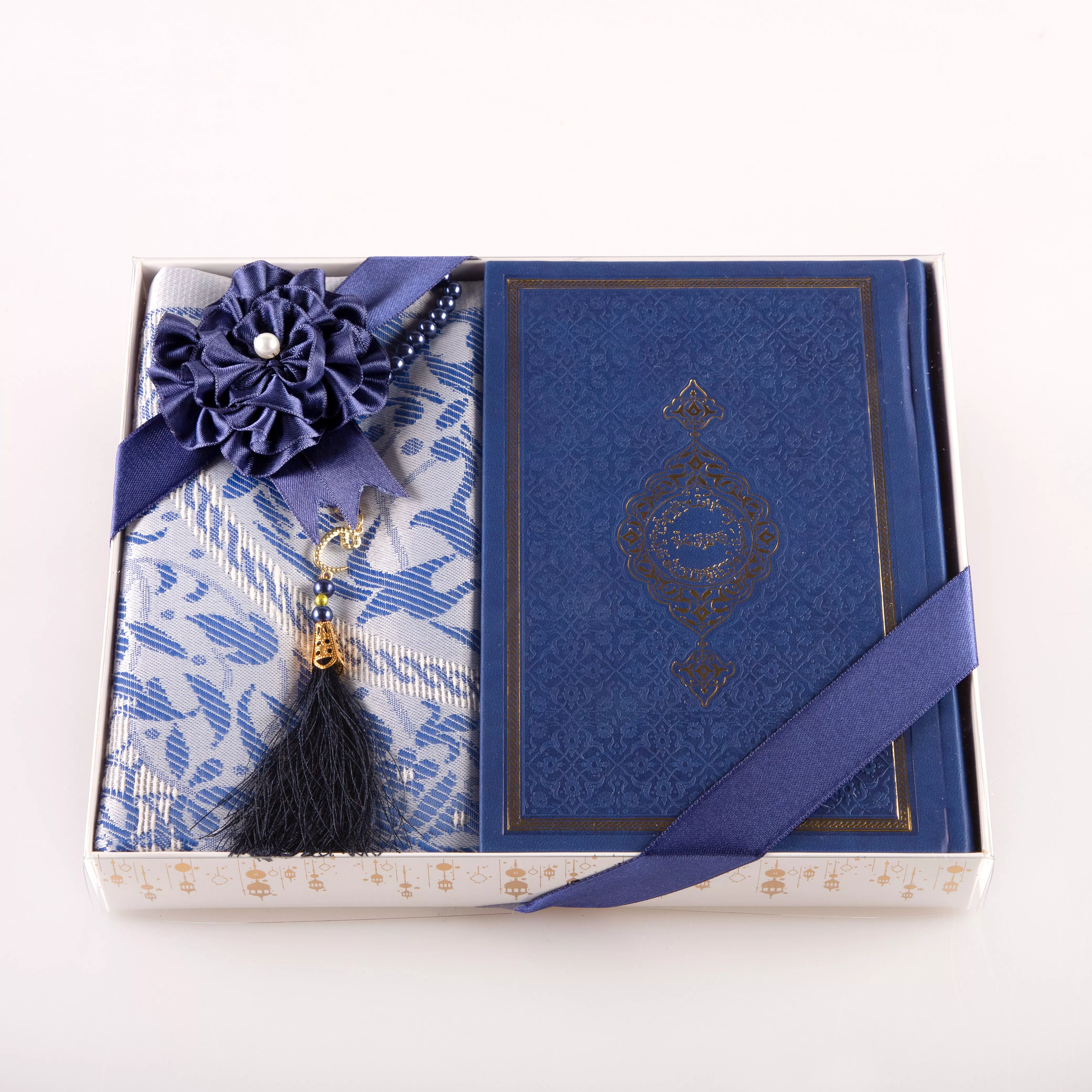 Kuran + Seccade + Tesbih Hediye Seti (Orta Boy, Termo Deri, Desenli Kutu, Lacivert)