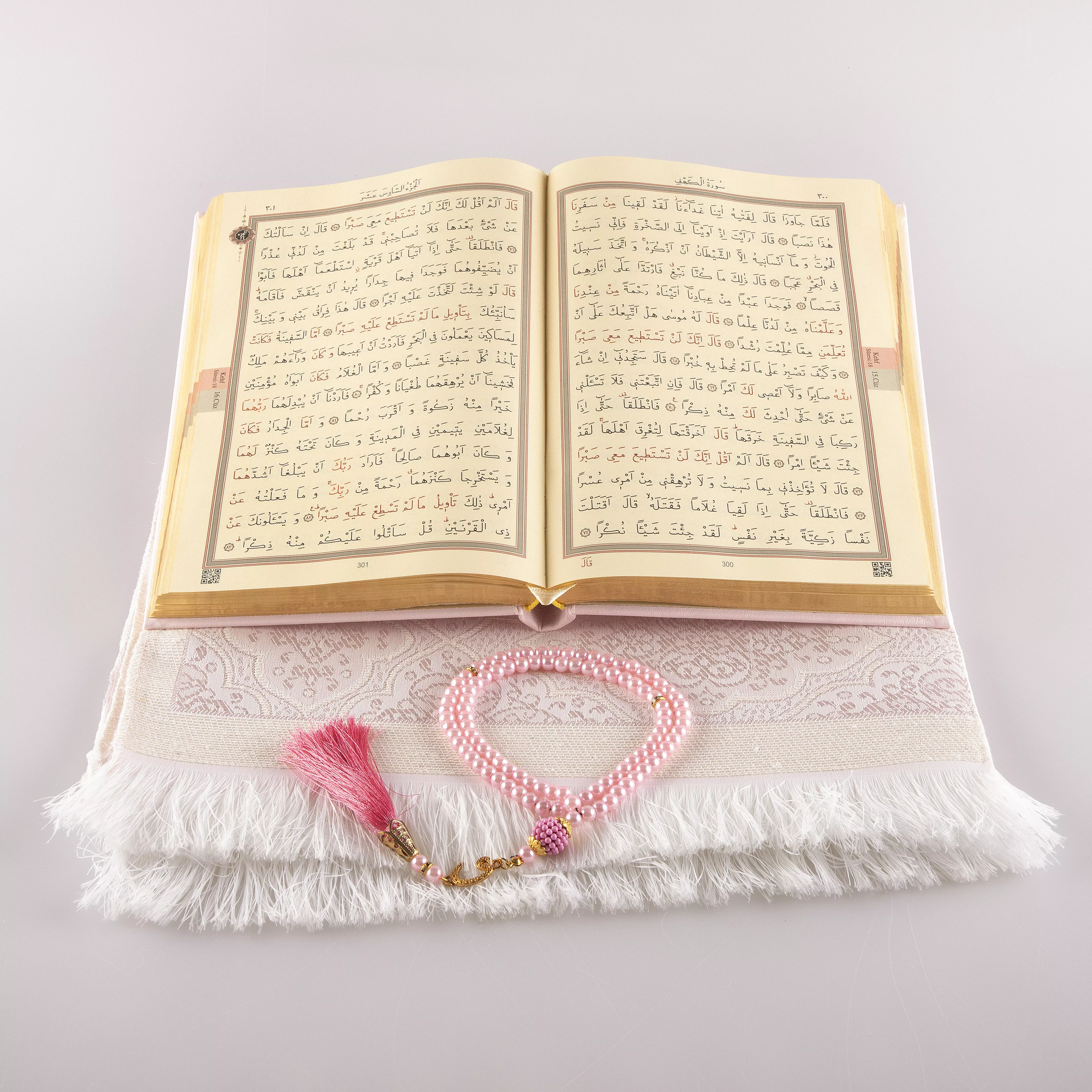 Kuran + Seccade + Tesbih Hediye Seti (Orta Boy, Termo Deri, Desenli Kutu, Toz Pembe)
