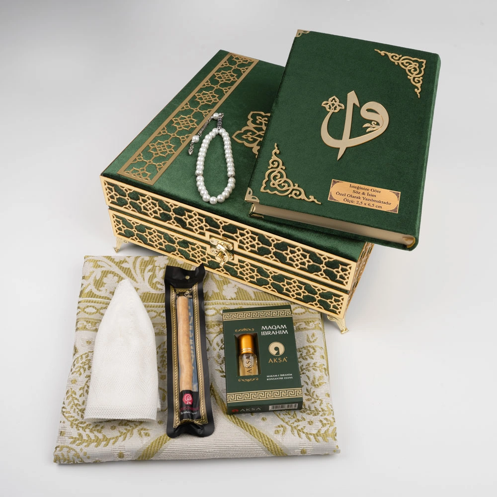 Kuran + Seccade + Tesbih + Takke + Misvak + Esans Hediye Seti (Orta Boy, Raşel Kare Kutu, Yeşil)