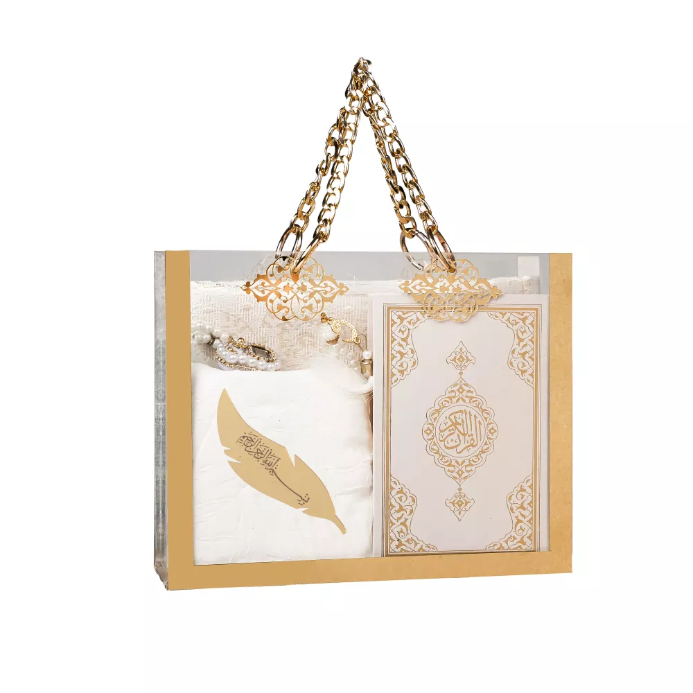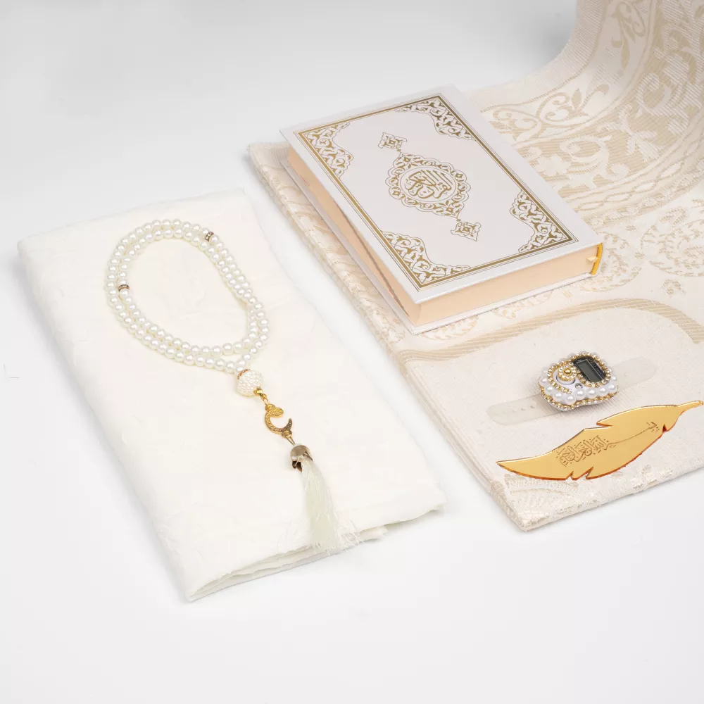 Kuran + Seccade + Eşarp + Tesbih + Zikirmatik + Ayraç Hediye Seti (Çanta Boy, Beyaz)