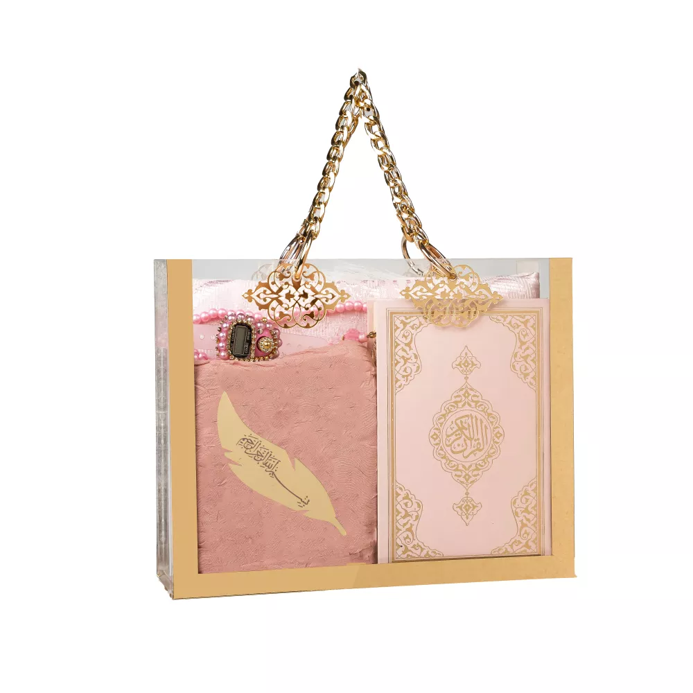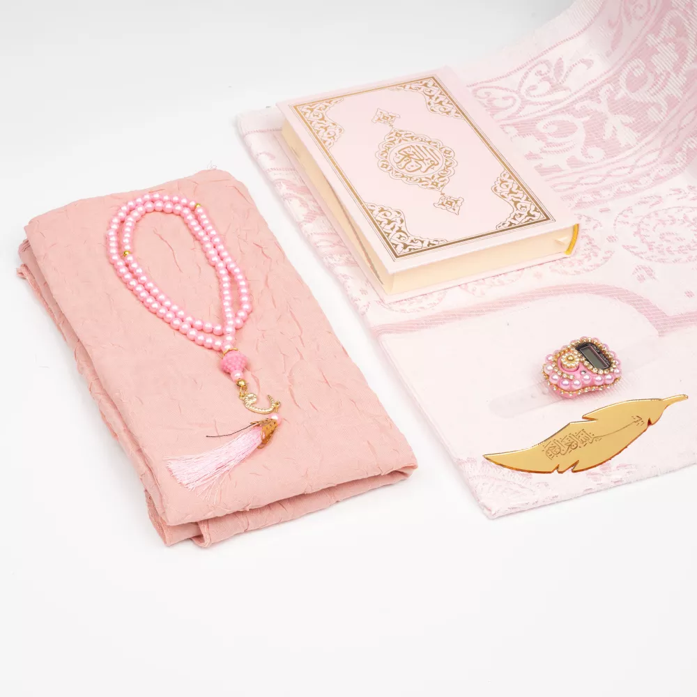 Kuran + Seccade + Eşarp + Tesbih + Zikirmatik + Ayraç Hediye Seti (Çanta Boy, Pembe)