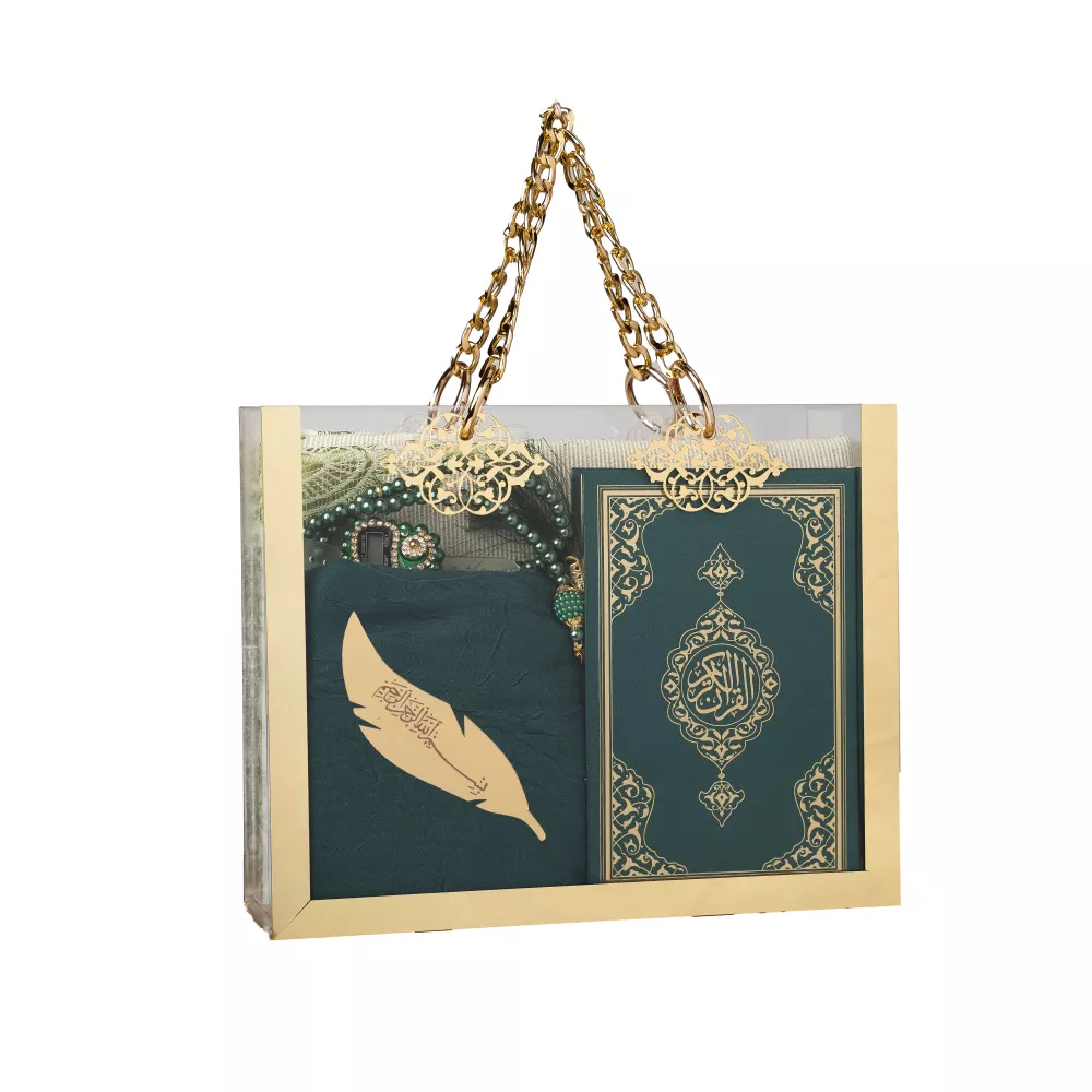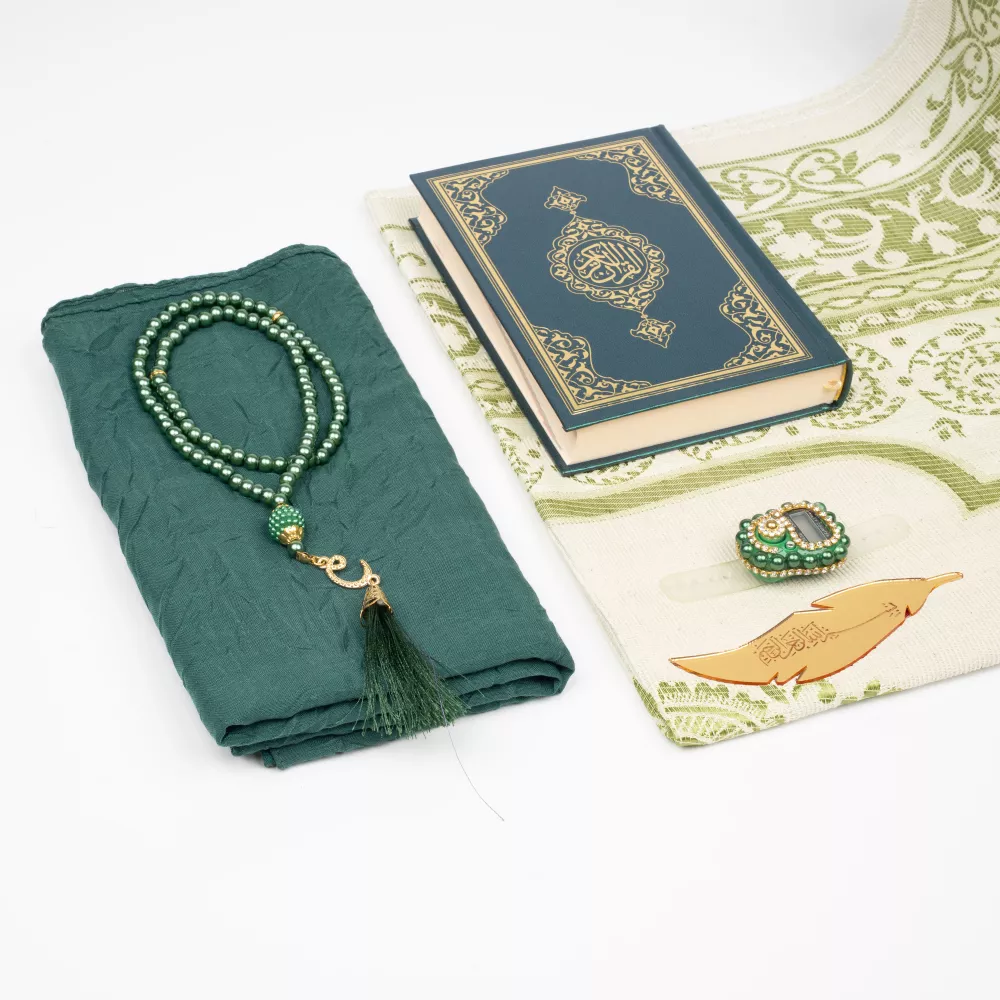 Kuran + Seccade + Eşarp + Tesbih + Zikirmatik + Ayraç Hediye Seti (Çanta Boy, Yeşil)