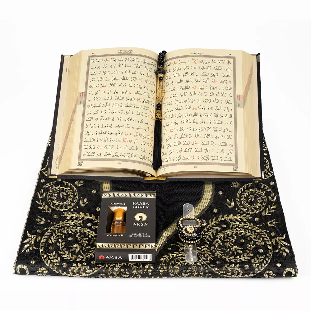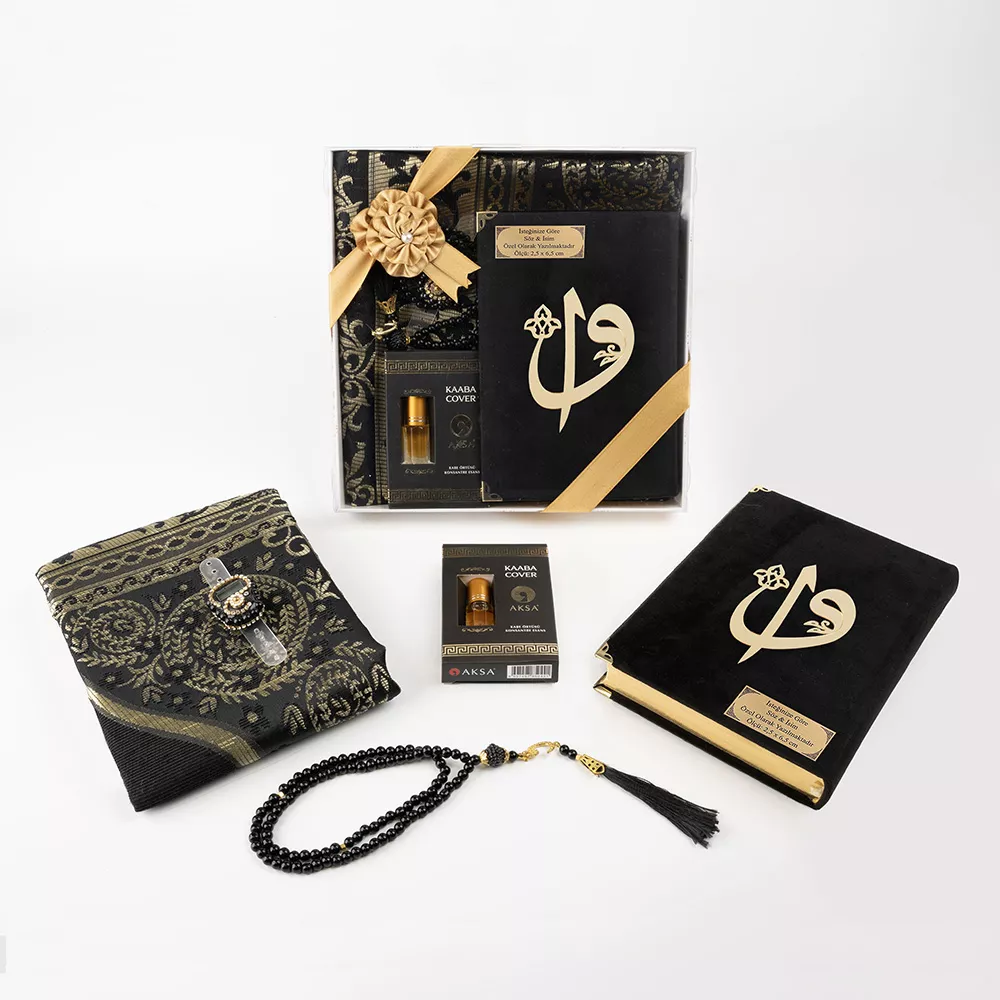 Kuran + Seccade + Tesbih + Zikirmatik + Koku Hediye Seti (Hafız Boy, Kadife, Siyah)