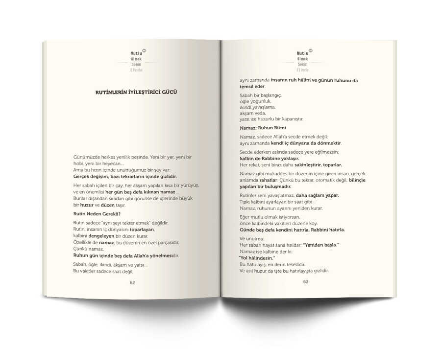 ARKA KAPAK YAZISIMutluluk… Herkesin aradığı ama çoğu zaman bulamadığı bir duygu. Çünkü pek çok kimse onu para, başarı ya da meşhur olmakta arar. Oysa mutluluk çoğu zaman yanımızdadır: bir tebessümde, bir arkadaşın selâmında, içten bir yakarışta ya da sabırla beklenen bir anda.