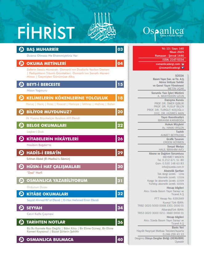 NEDEN OSMANLICA DERGİ?Osmanlıca ecdadımızın kullandığı ve 600 yıllık bir kültür birikimi ortaya koyduğu bir yazı dilidir. Osmanlıcayı öğrenmek hepimize bir cihette vefa borcudur. Osmanlıca dergi, bu altyapıya kolay ulaştıracak bir anahtar hükmündedir.
