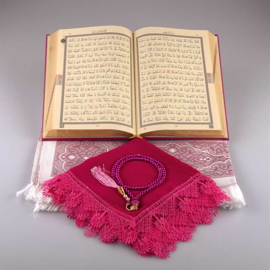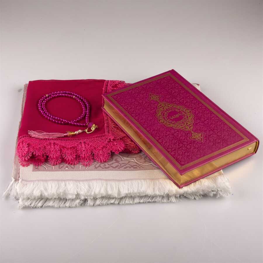 Şal + Seccade + Tesbih + Kuran Hediye Seti (Orta Boy, Fuşya Pembe)