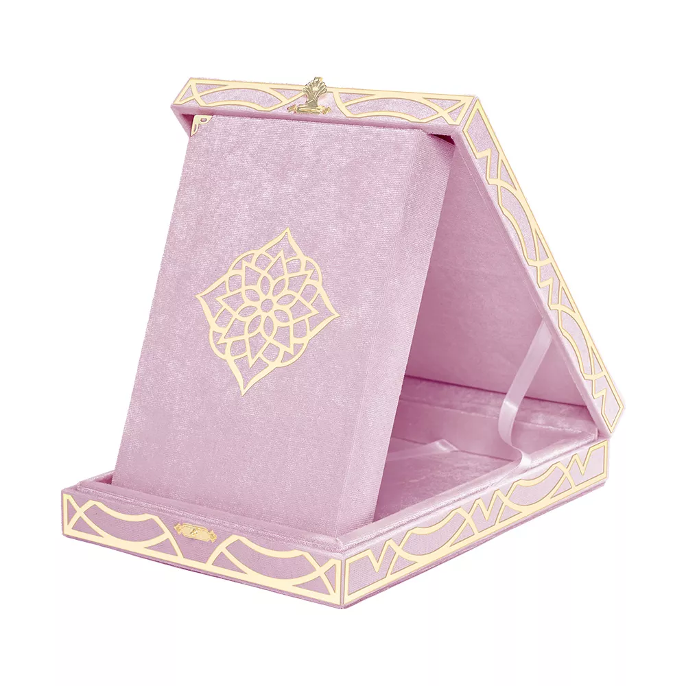 Kadife Kutulu Kur'an-ı Kerim (Orta Boy, Pleksili Desen, Bebe Pembe)