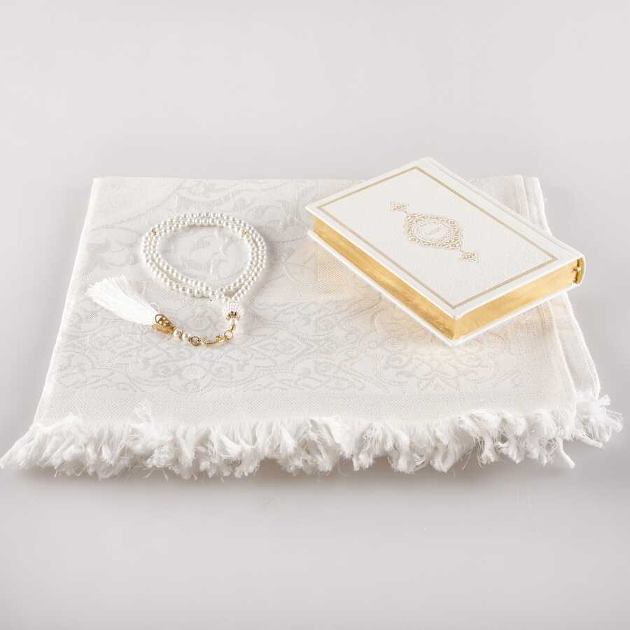 Prayer Mat + Salah Beads + Quran Gift Set (Bag Size, White1)