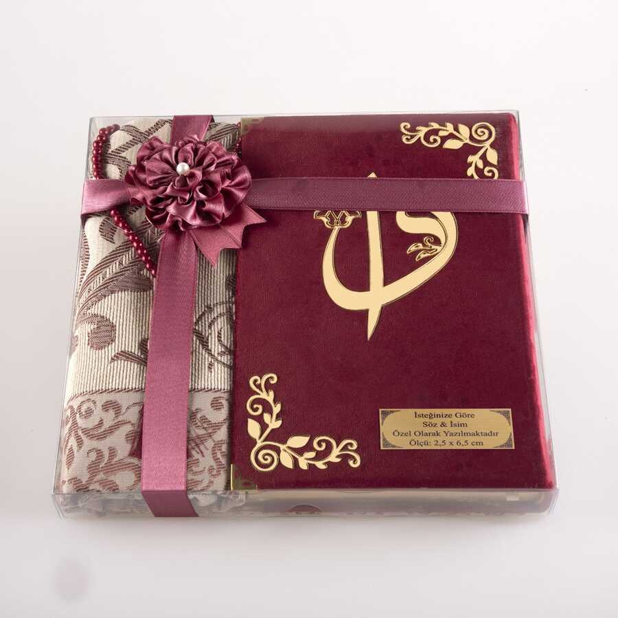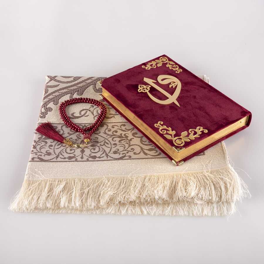 Prayer Mat + Salah Beads + Quran Gift Set (Medium Size, Velvet, Dark Maroon)