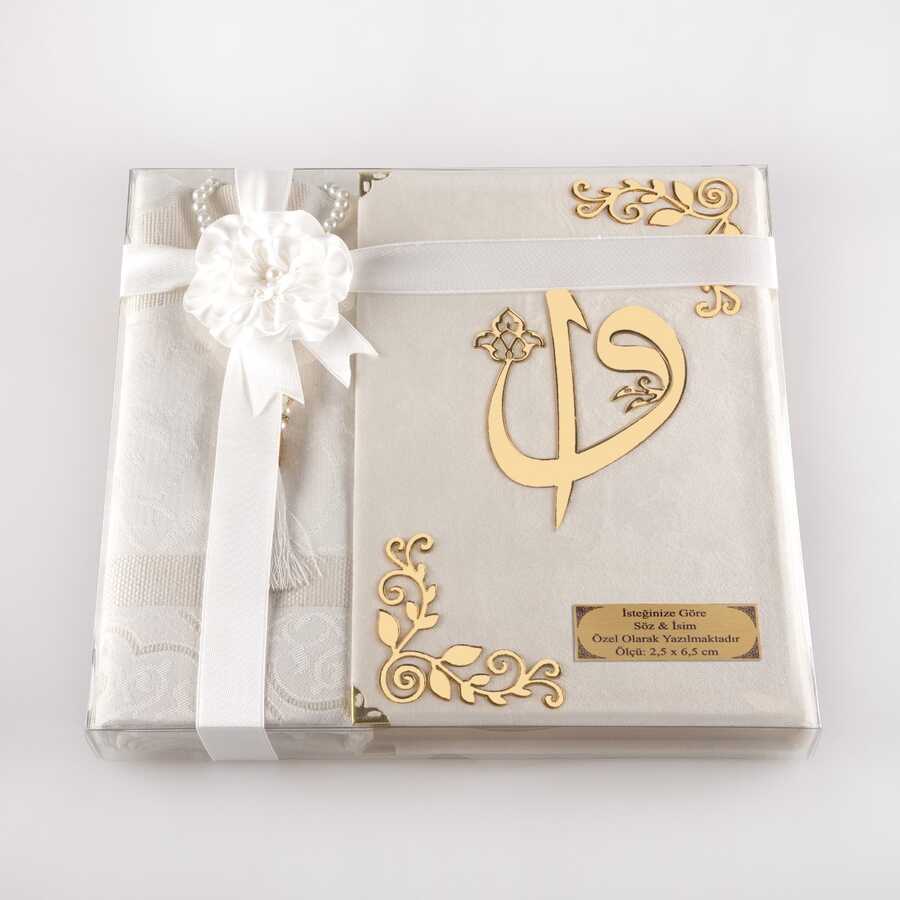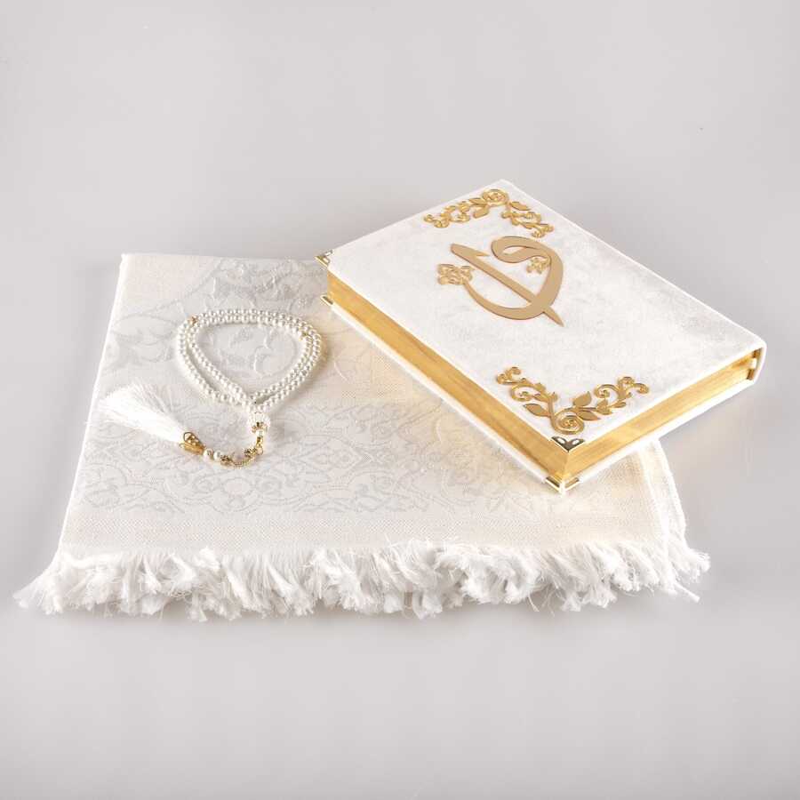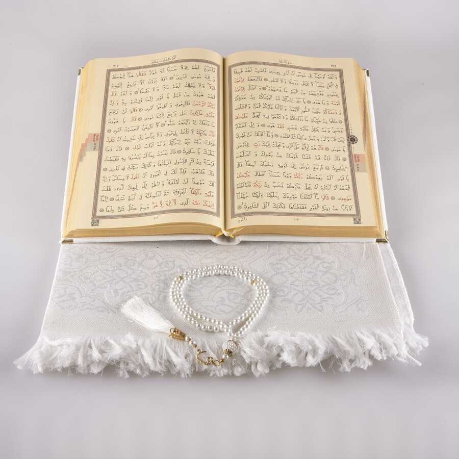 Prayer Mat + Salah Beads + Velvet Bound Quran Gift Set (Medium Size, White1)