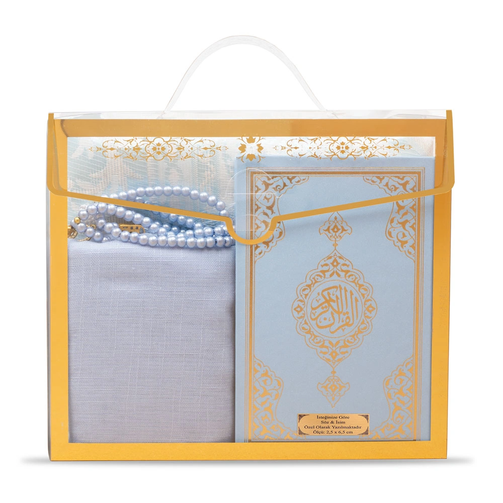 Şal + Seccade + Tesbih + Kuran Hediye Seti (Çanta Boy, Asetat Çanta, Mavi)
