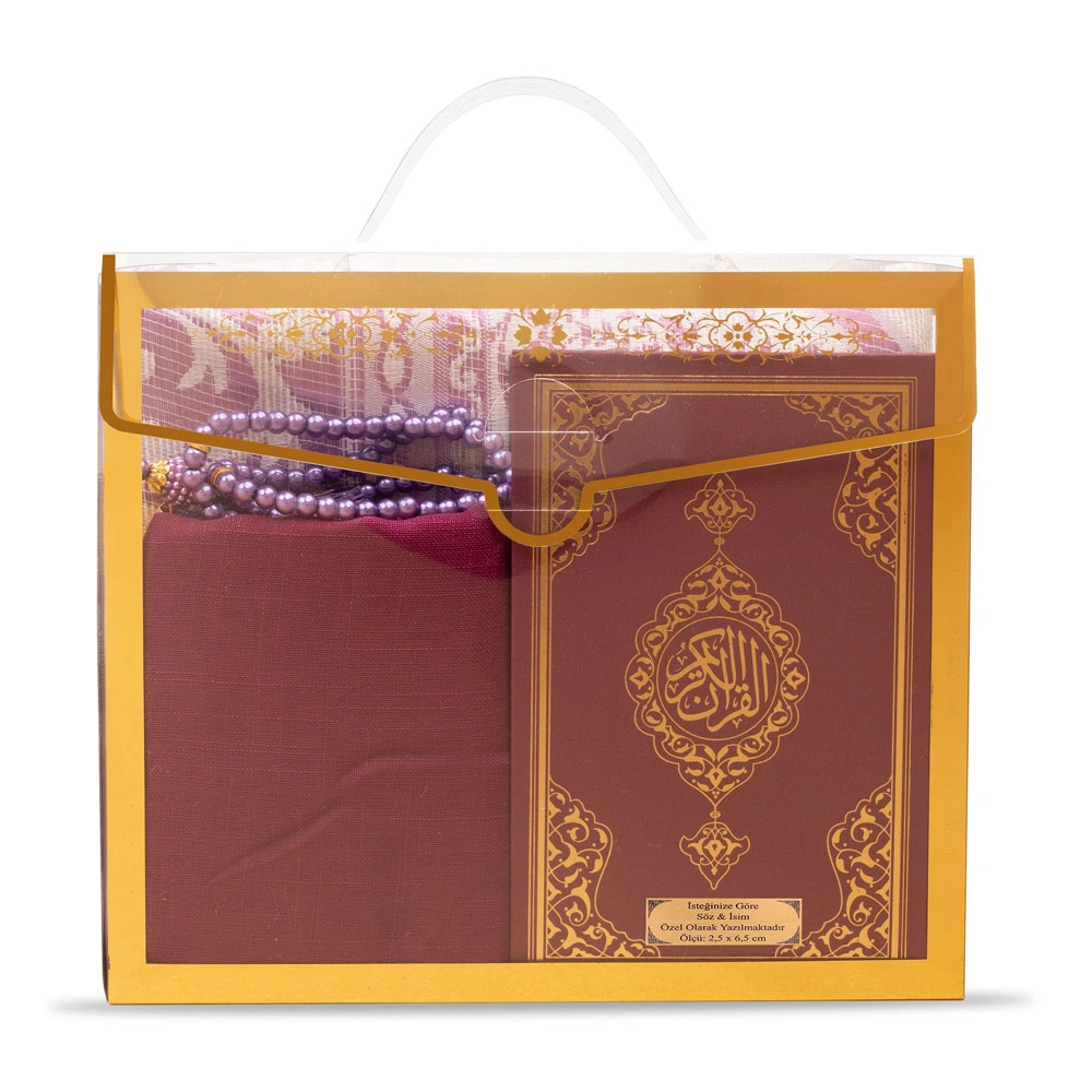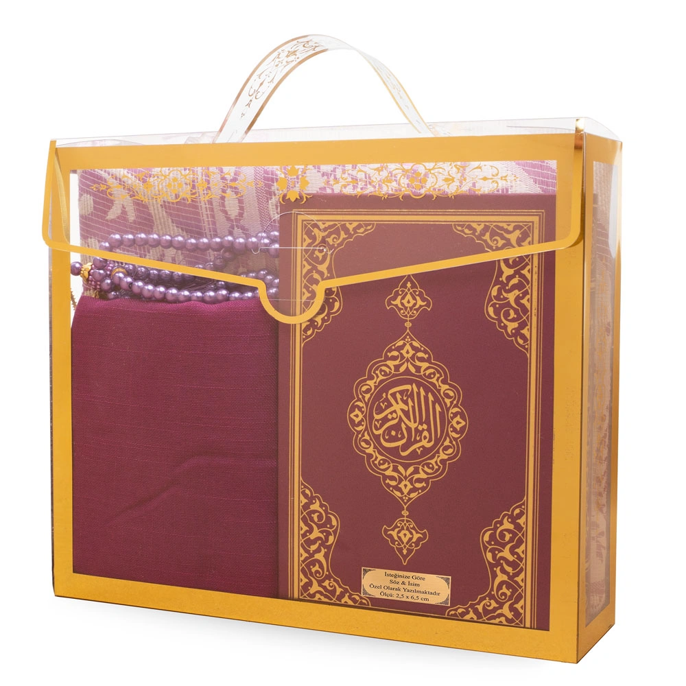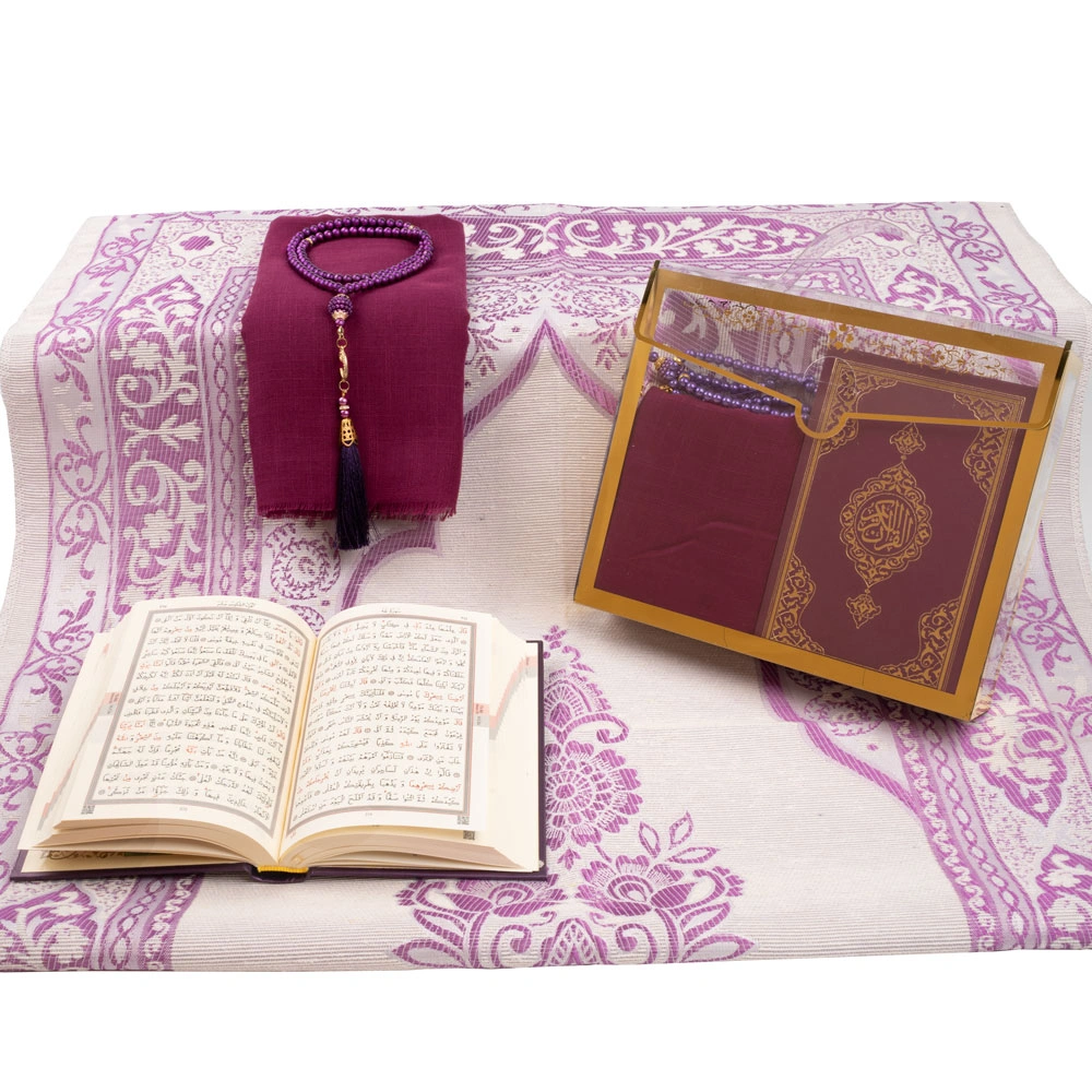 Şal + Seccade + Tesbih + Kuran Hediye Seti (Çanta Boy, Asetat Çanta, Mor)